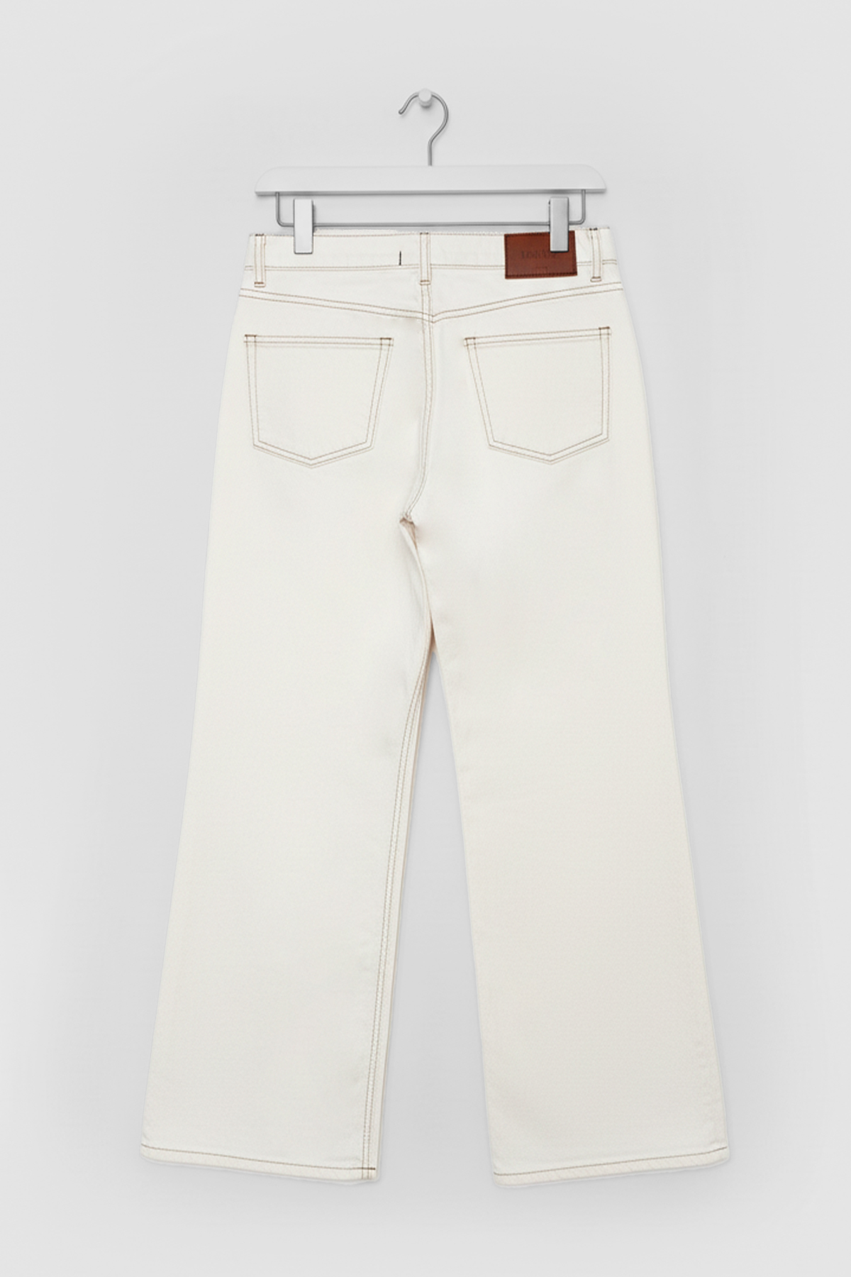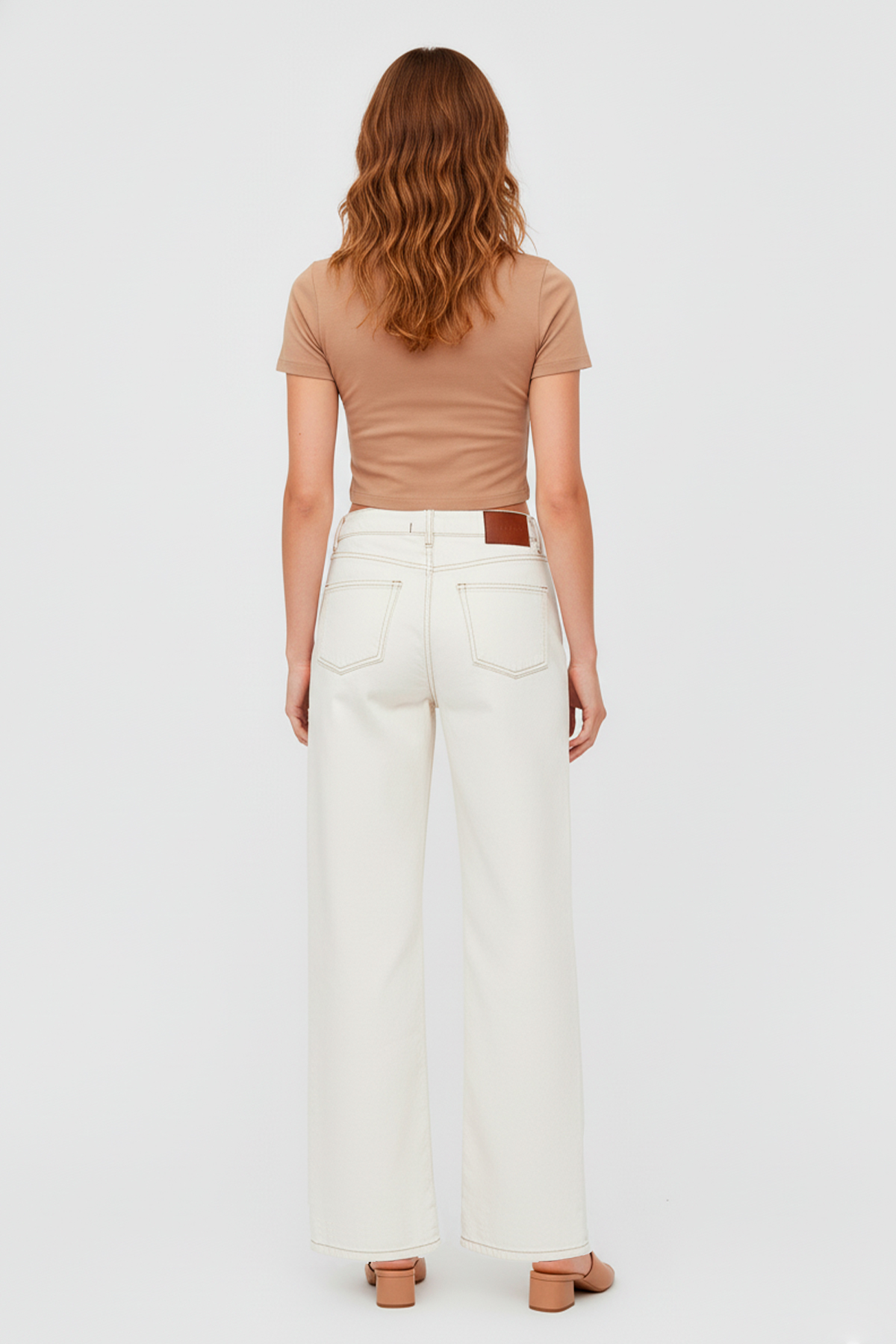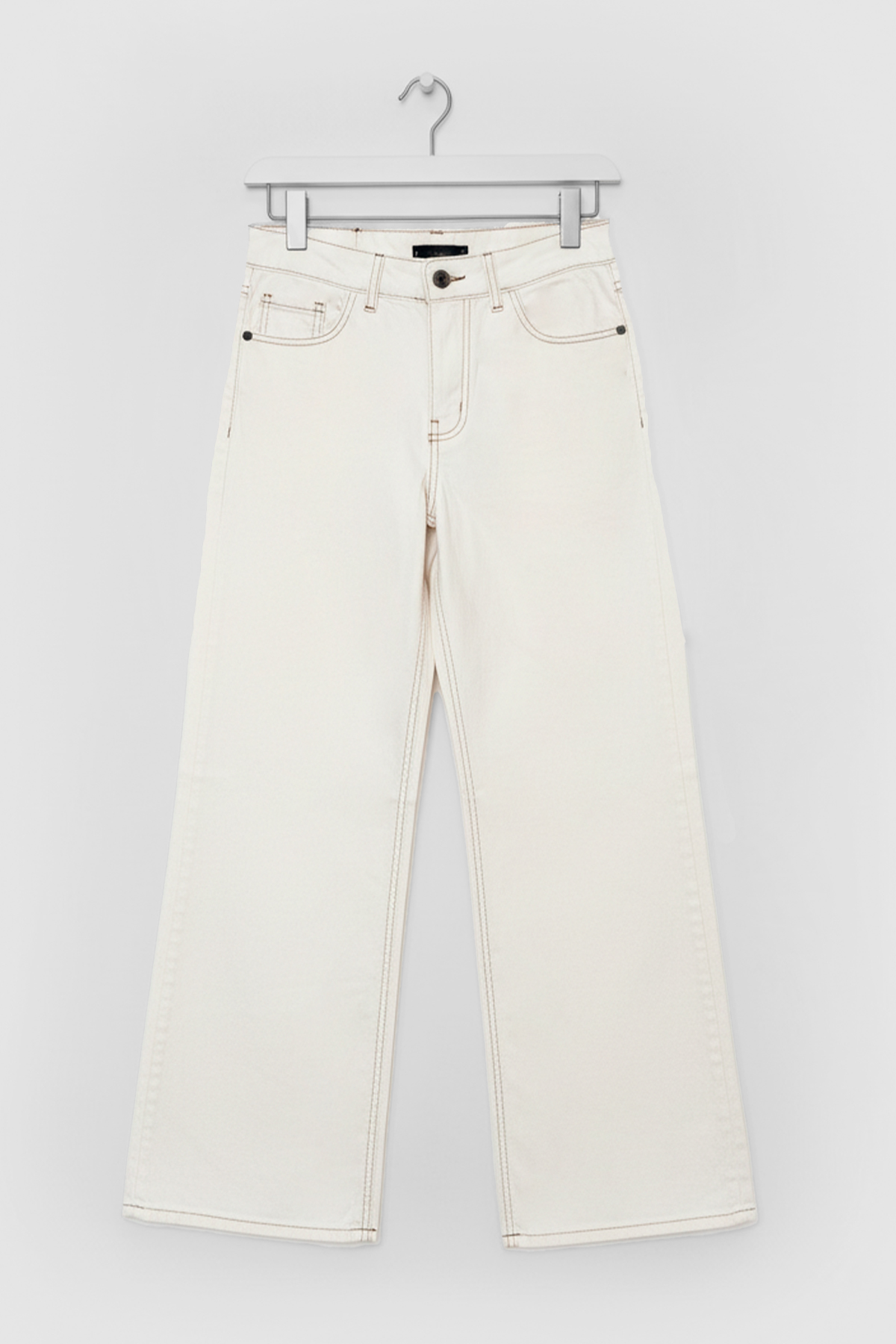 Pantalón wide leg rígido de gabardina crudo con hilo camel, tiro medio.