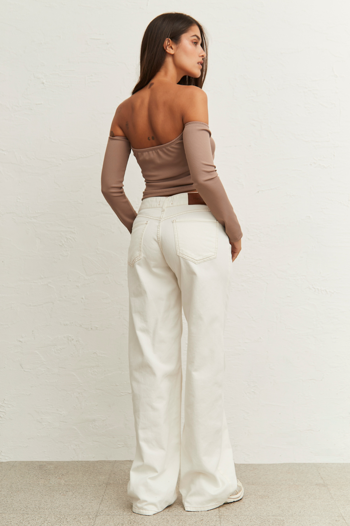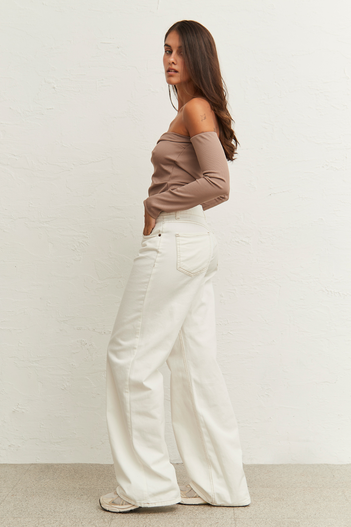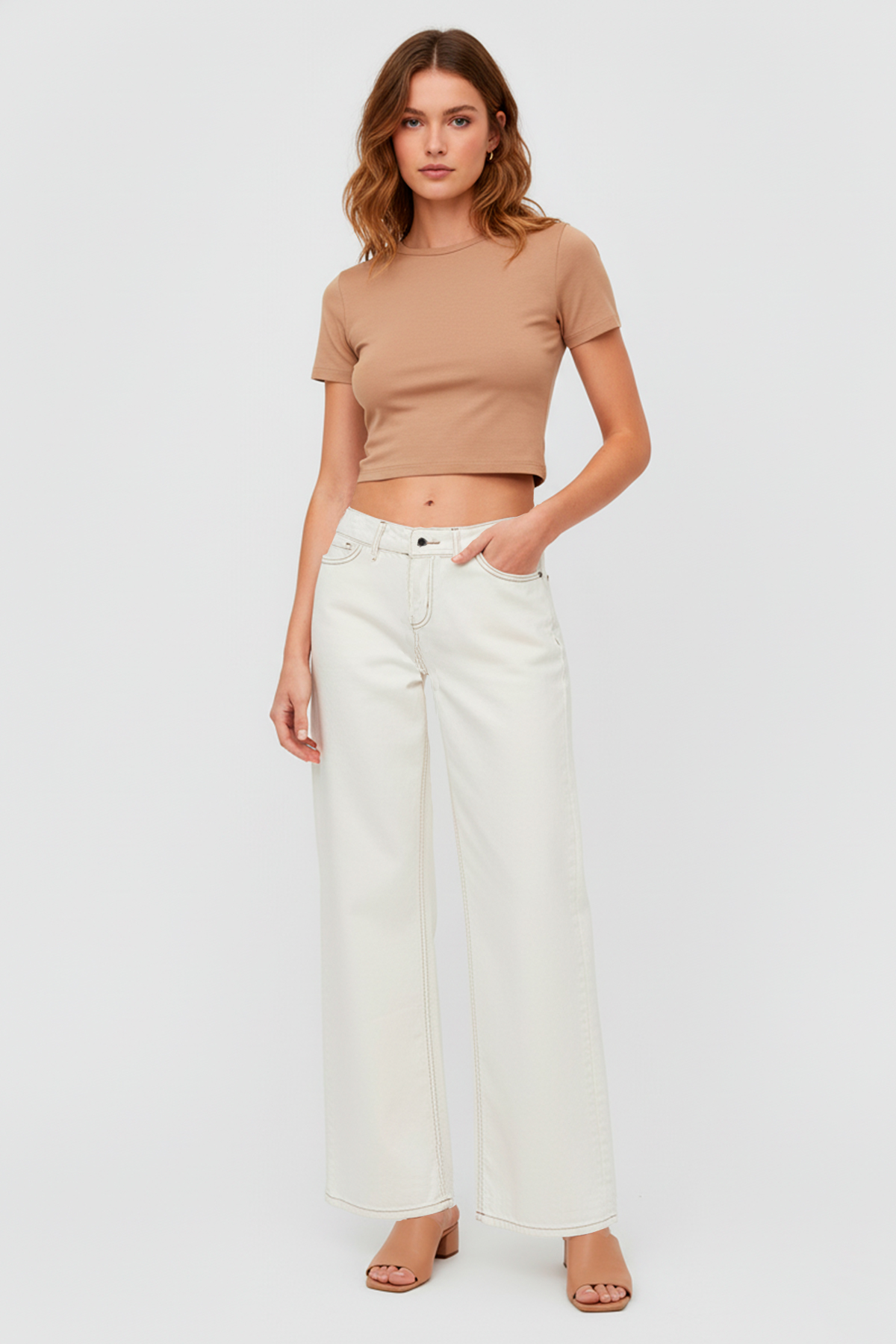 Pantalón wide leg rígido de gabardina crudo con hilo camel, tiro medio.