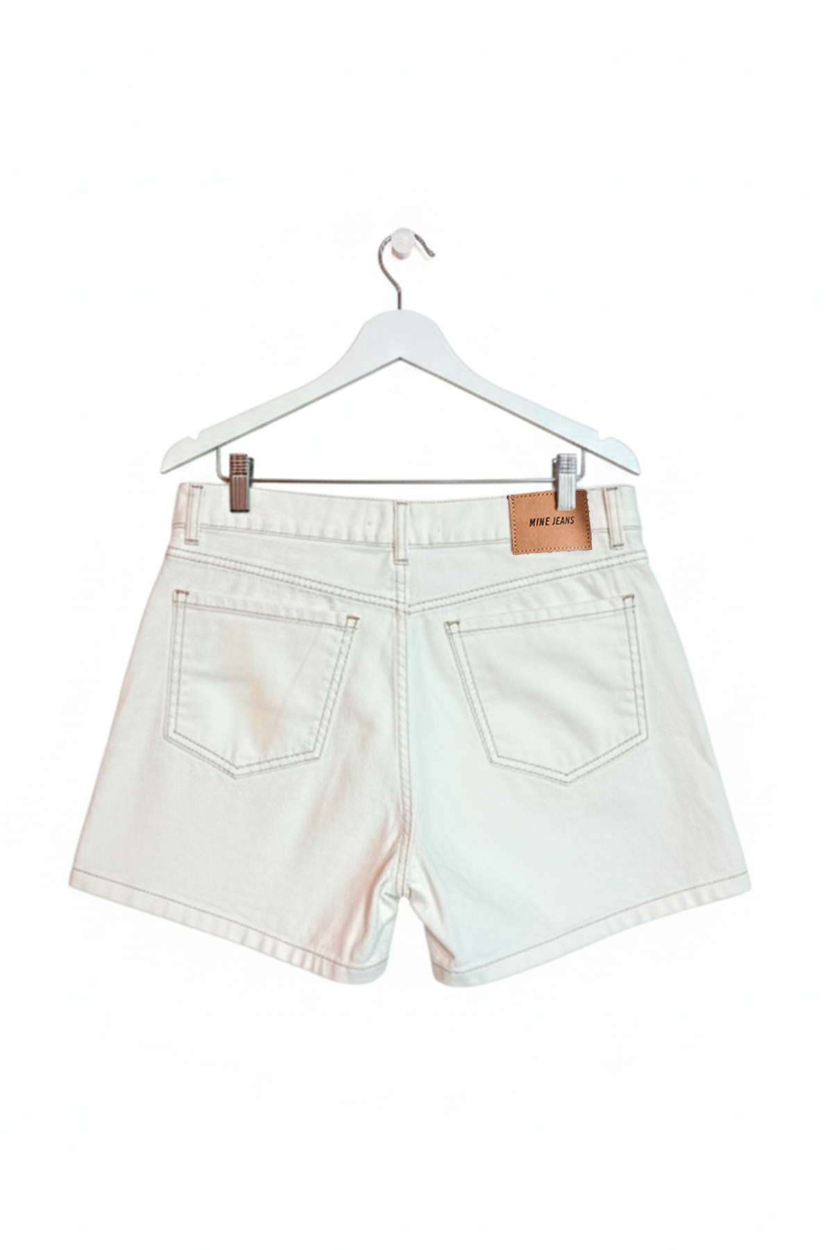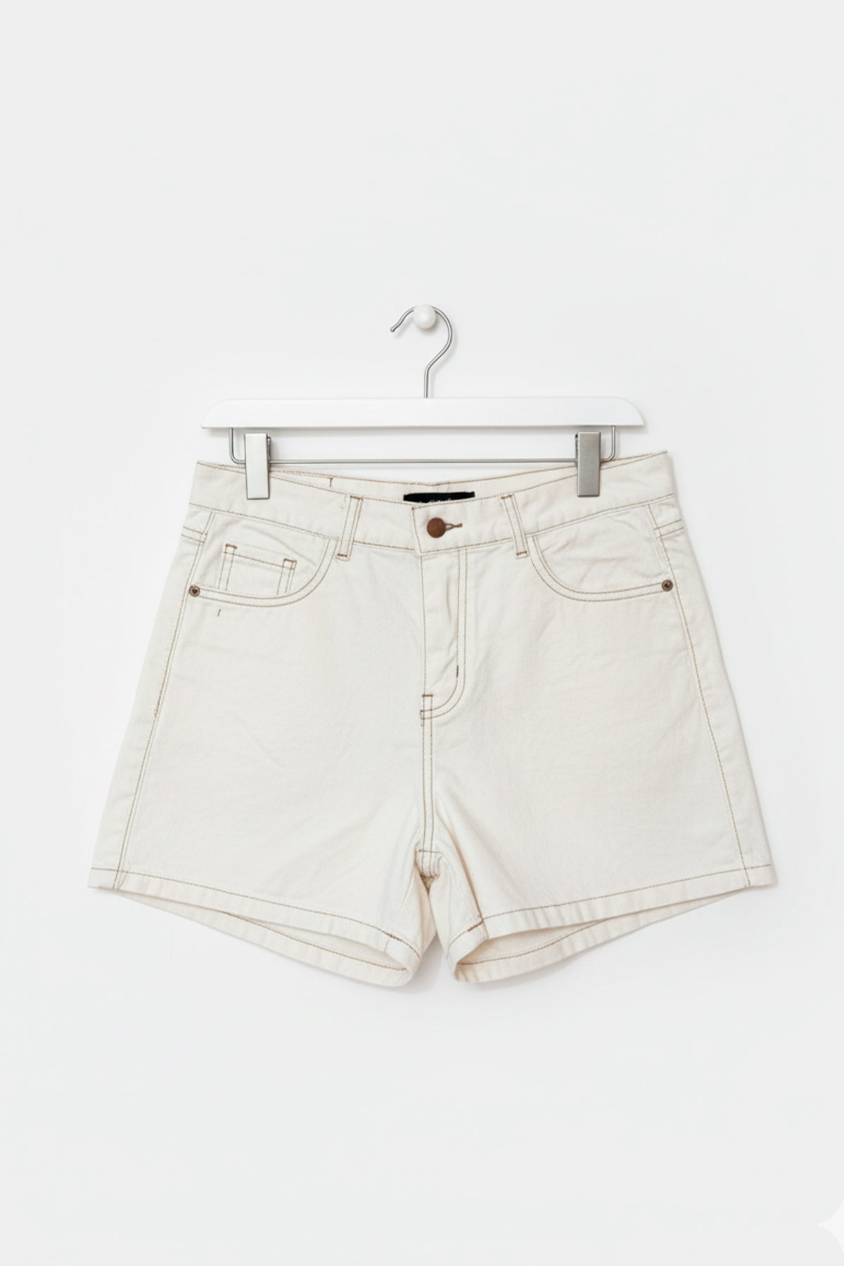 Short mom de gabardina rígida color crudo con hilo beige, tiro alto.