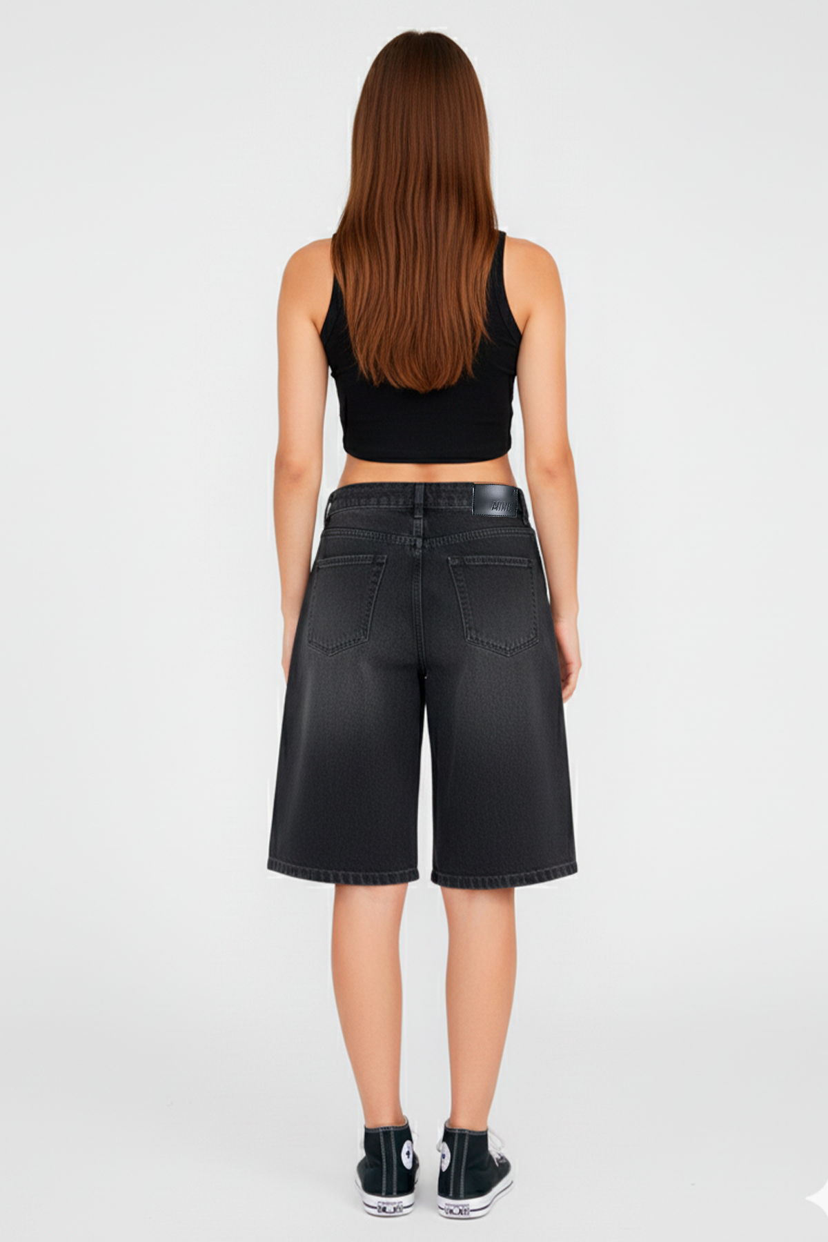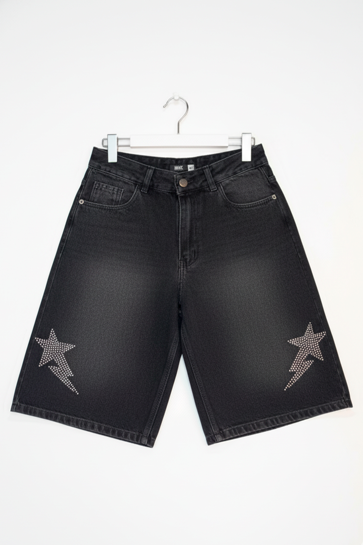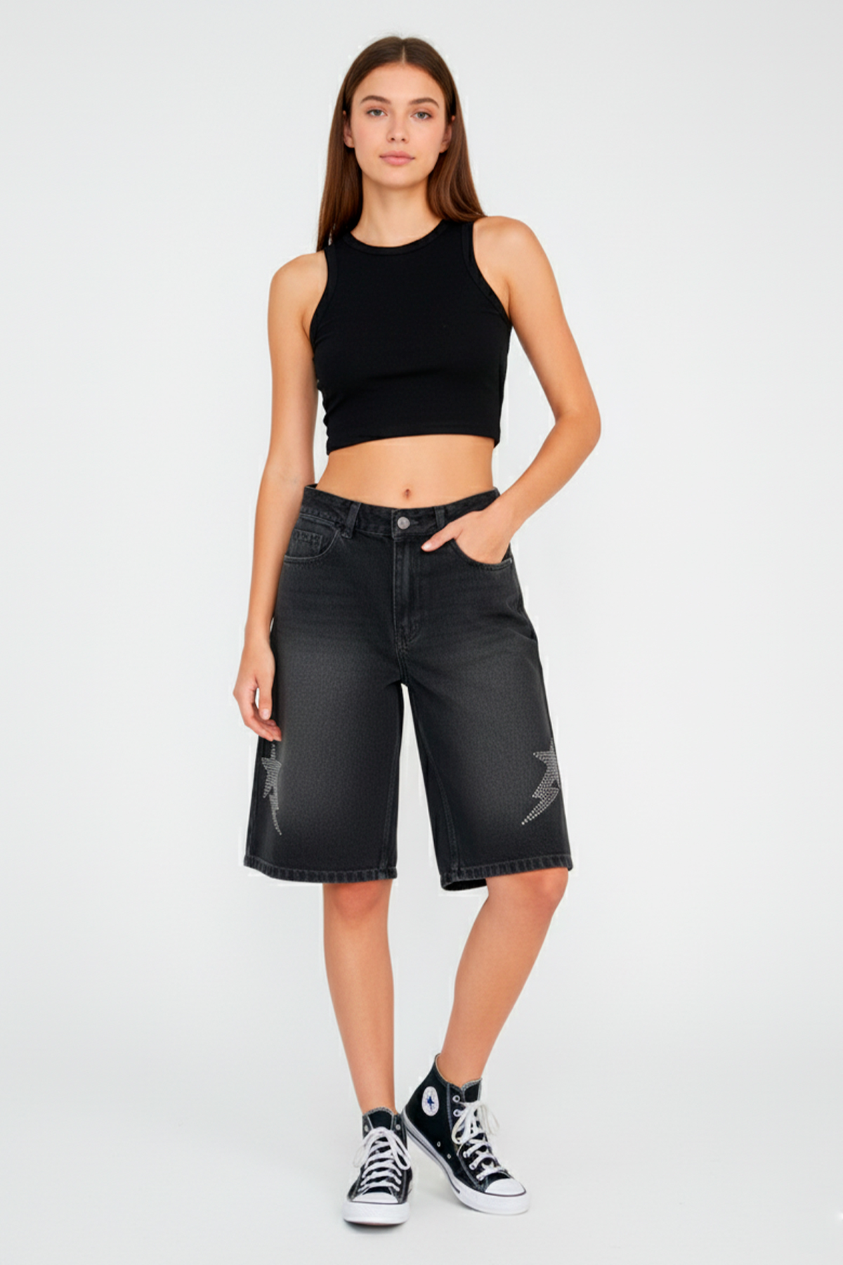 Bermuda amplia negra stone rígida con localizado con strass en el frente, tiro medio.