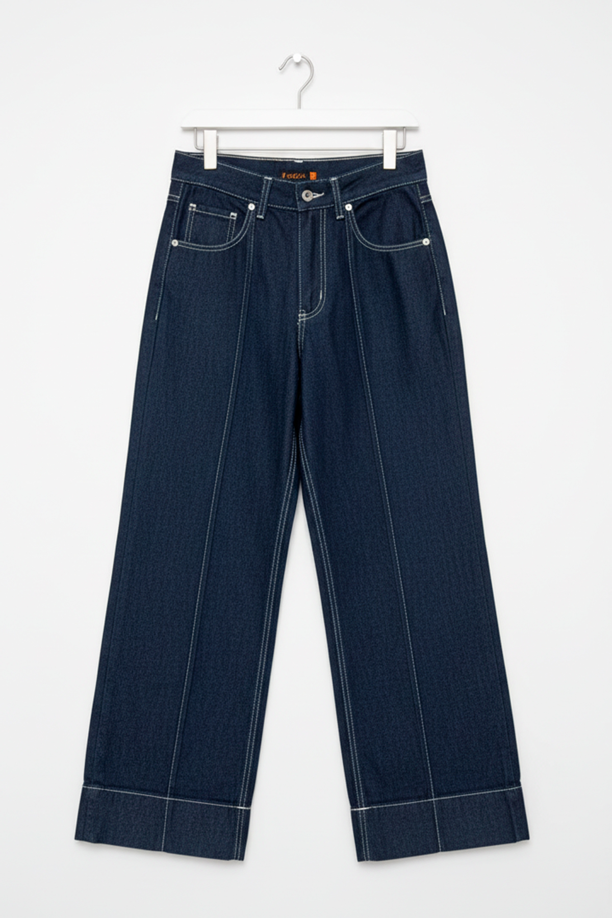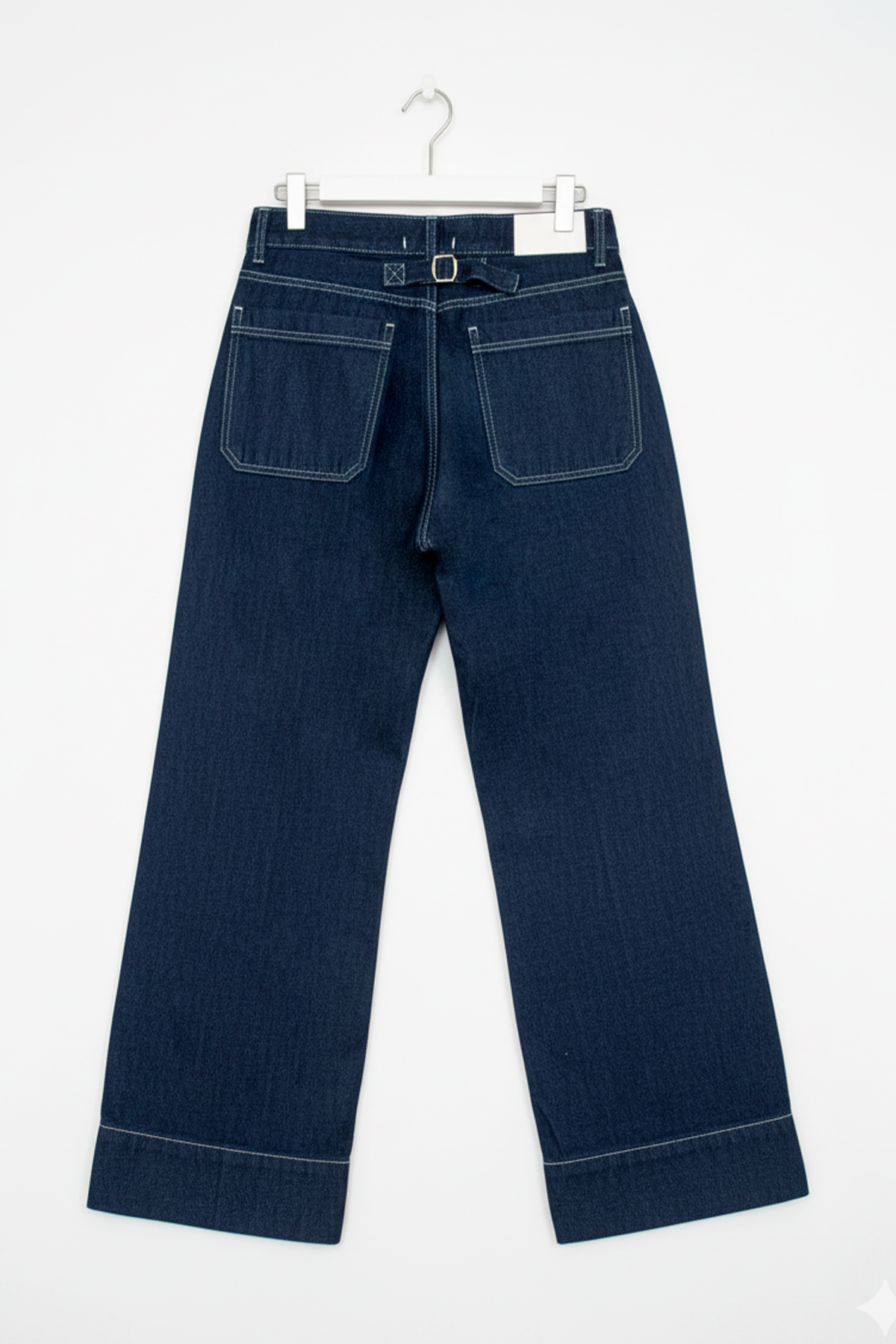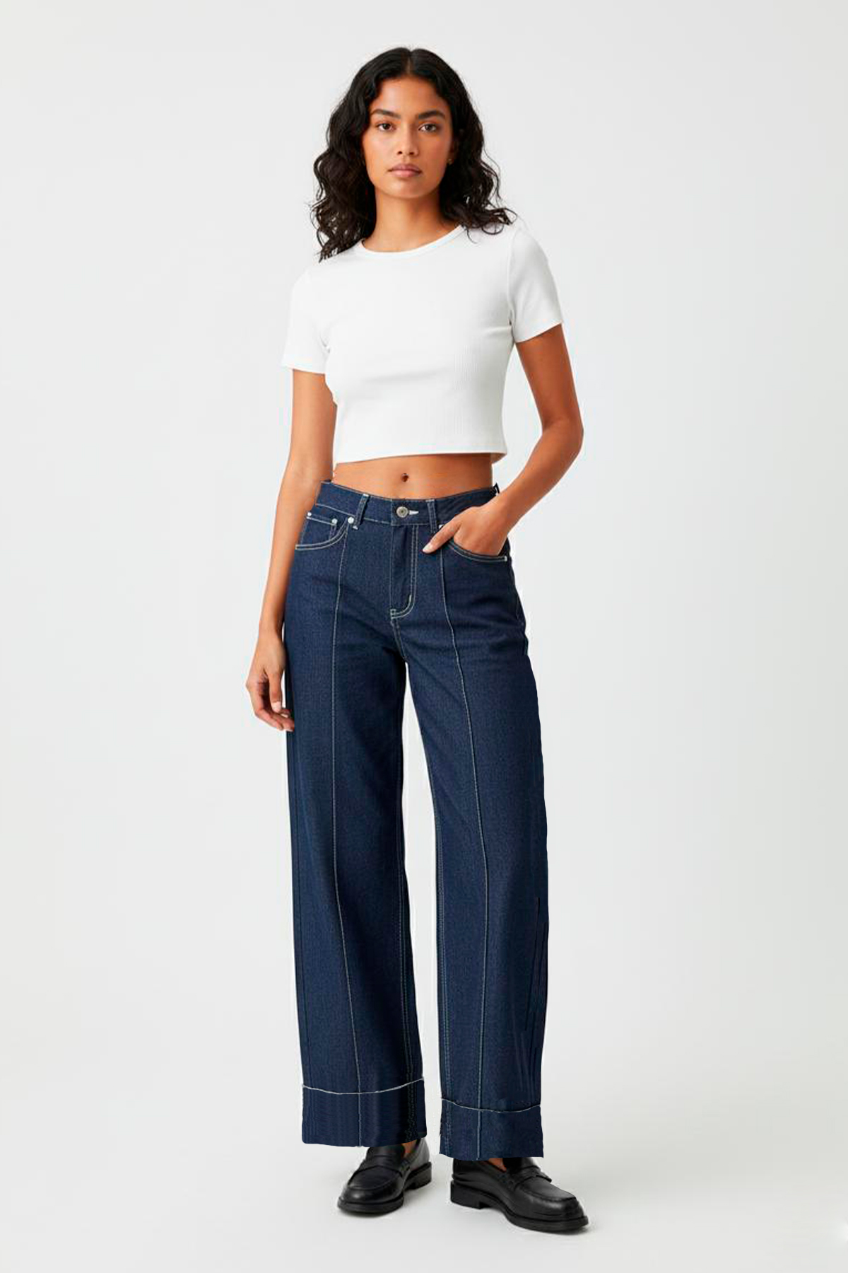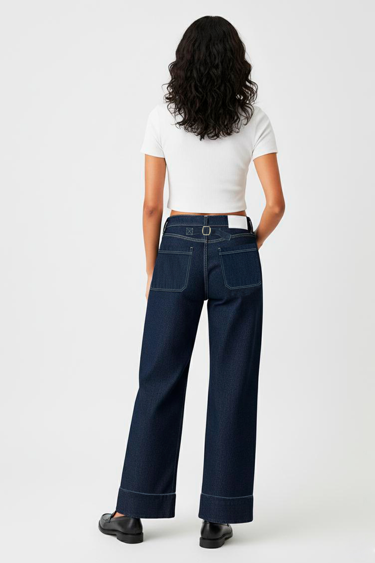 Pantalón wide leg de jean rígido azul con alforza en el frente y hebilla regulable en la espalda, tiro medio.