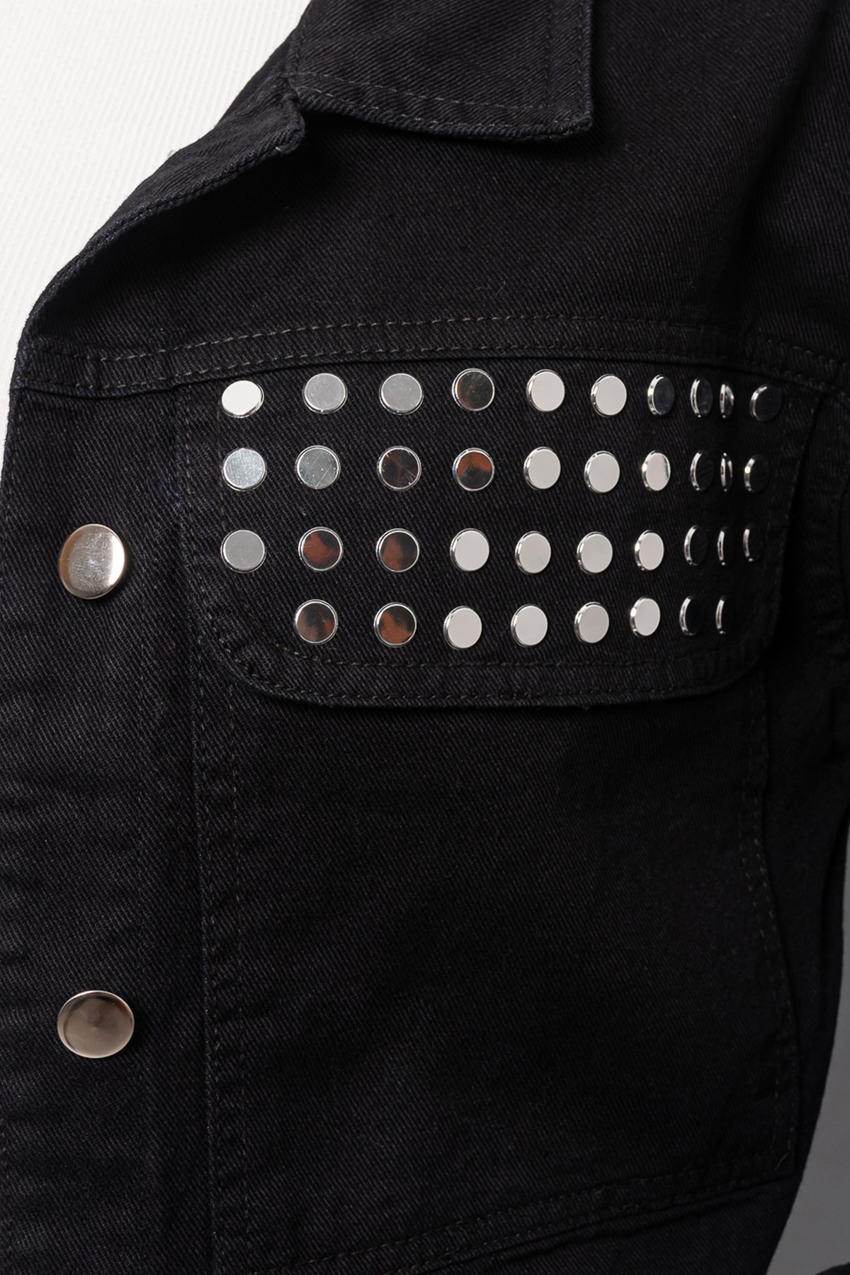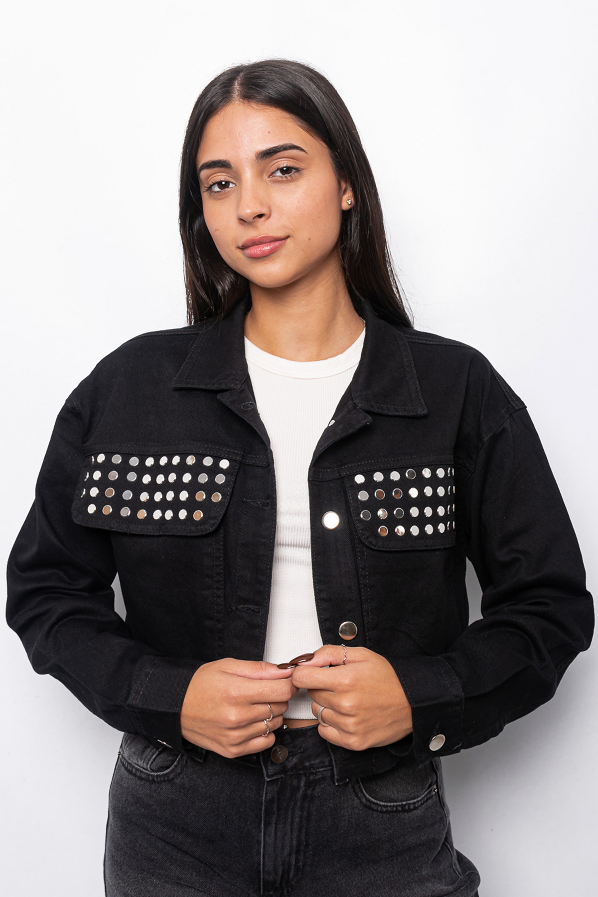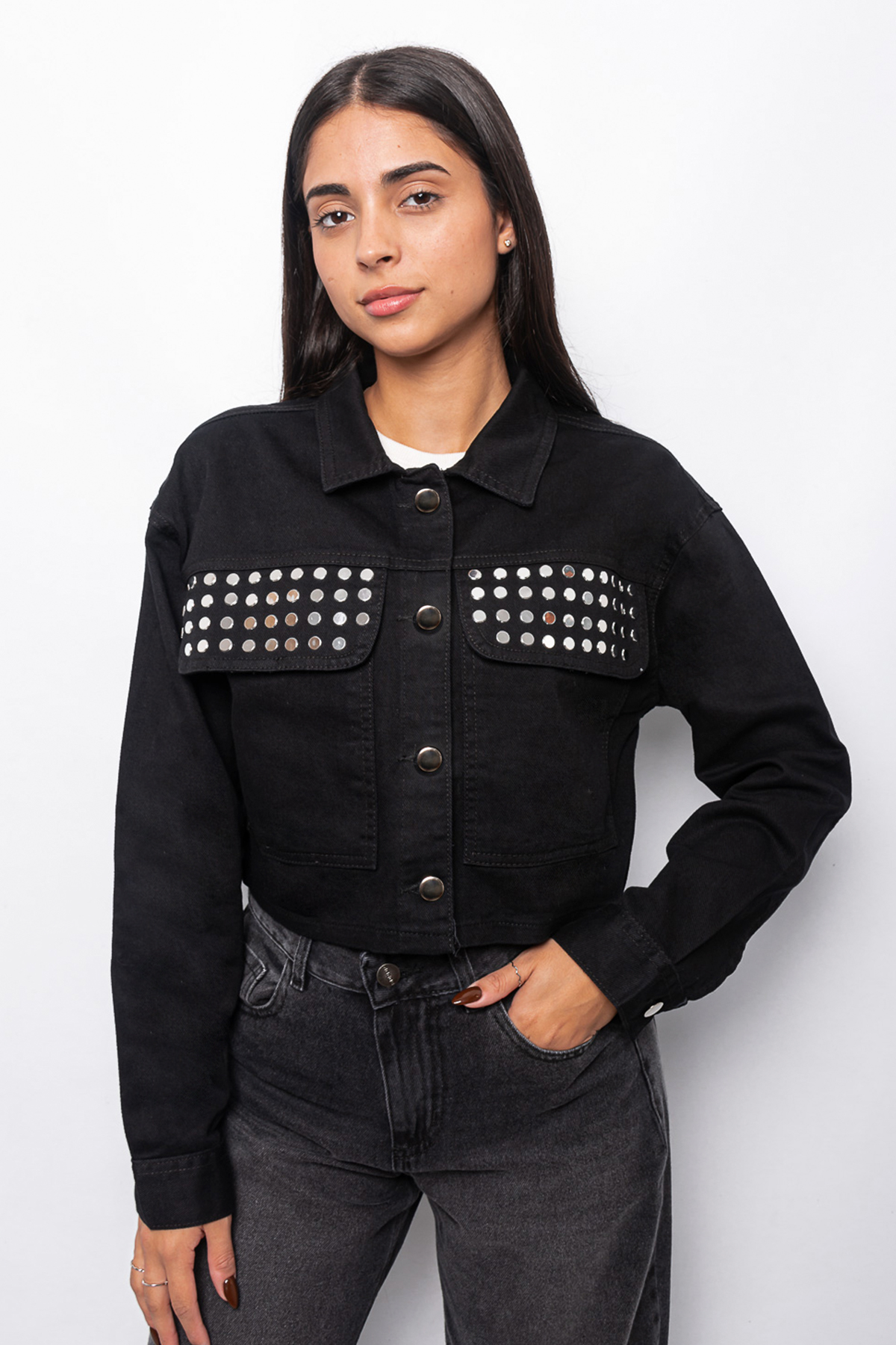 Campera cargo negra rígida con bolsillos y strass de tacha en el frente.