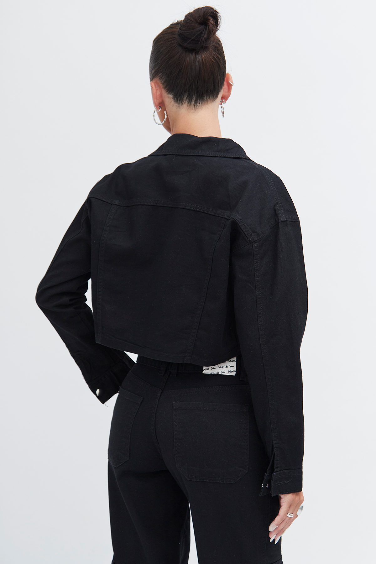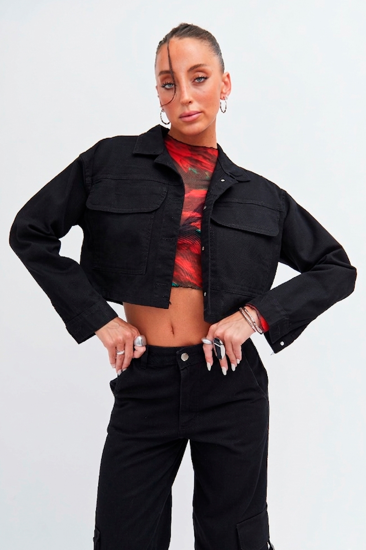 Campera cargo negra rígida con bolsillos en el frente.