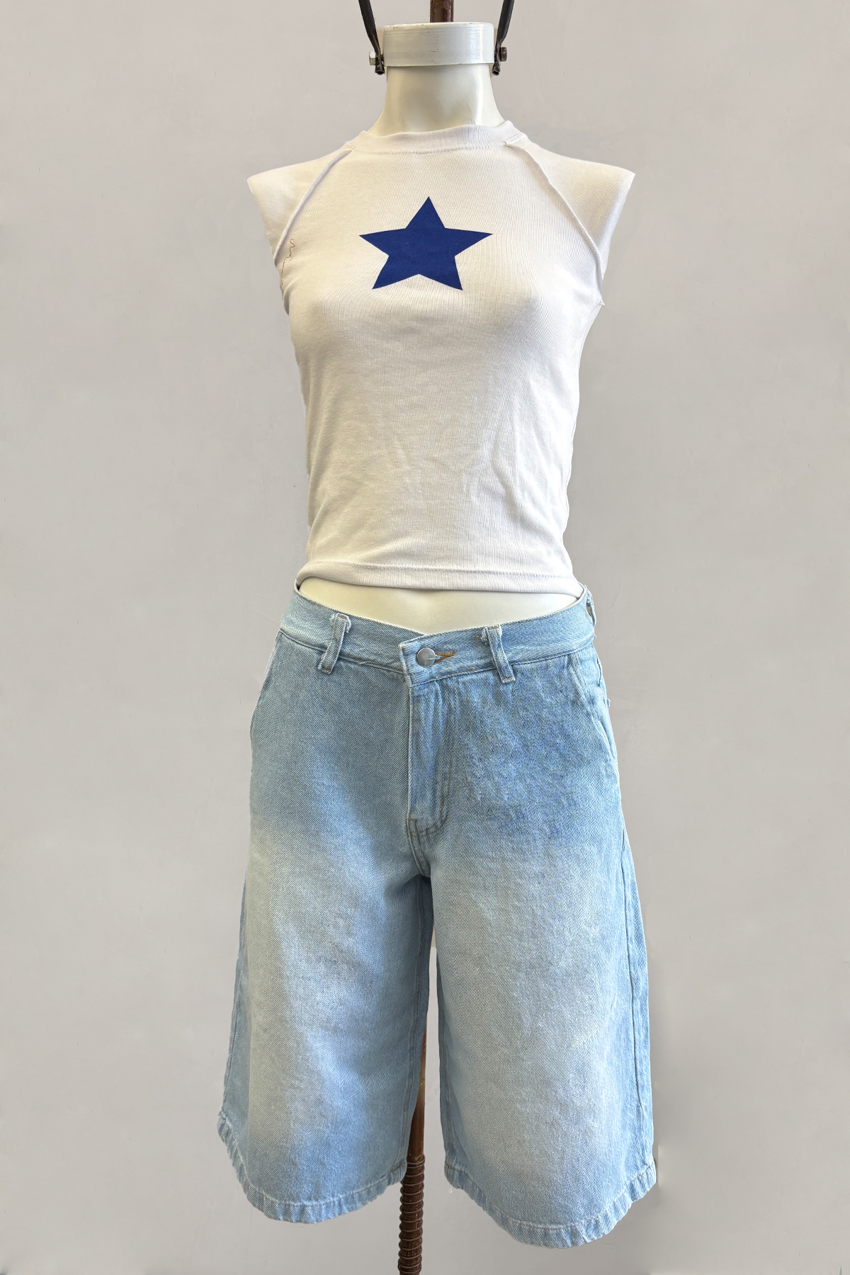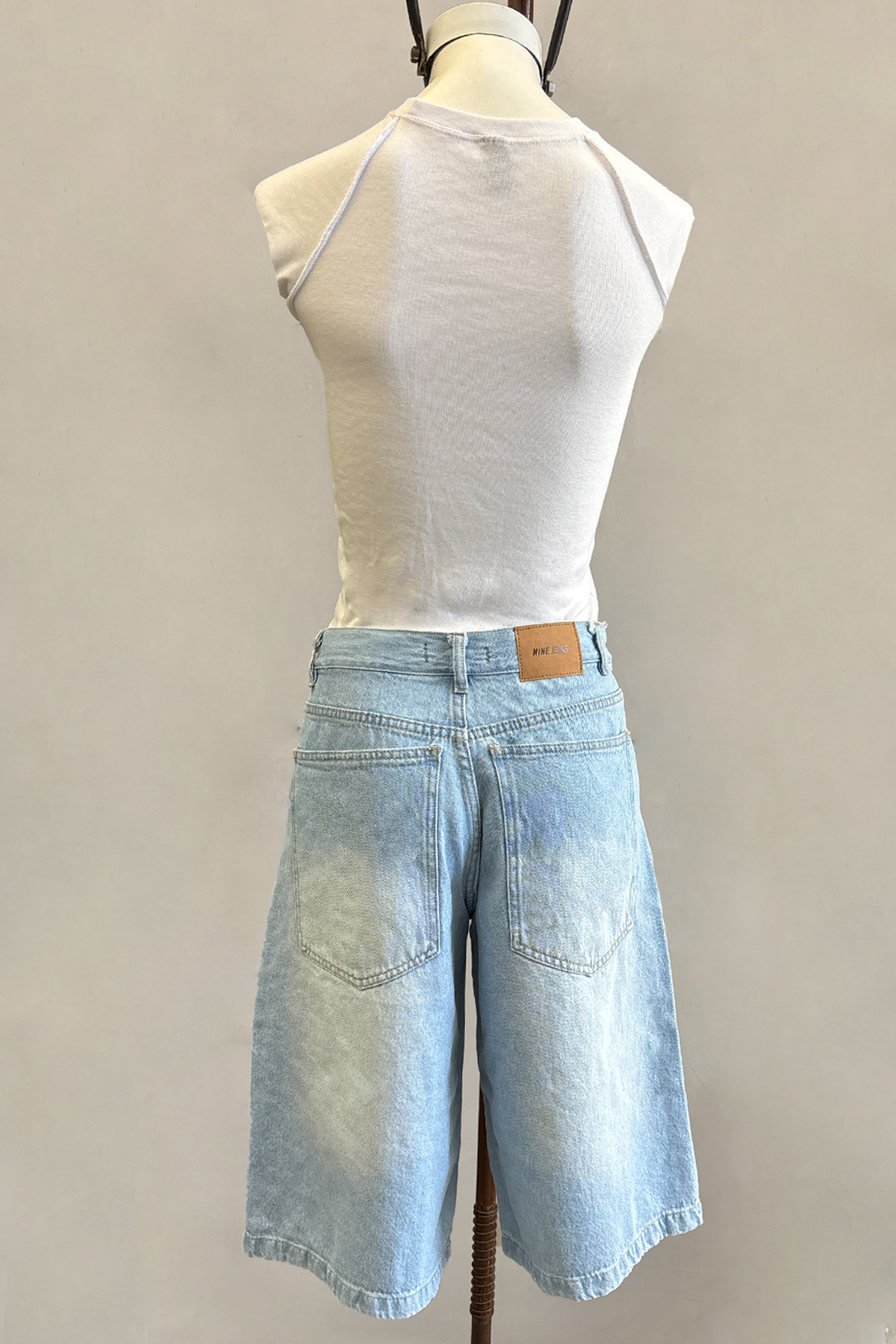 Bermuda skater amplia de jean rígido celeste con localizado, tiro medio.