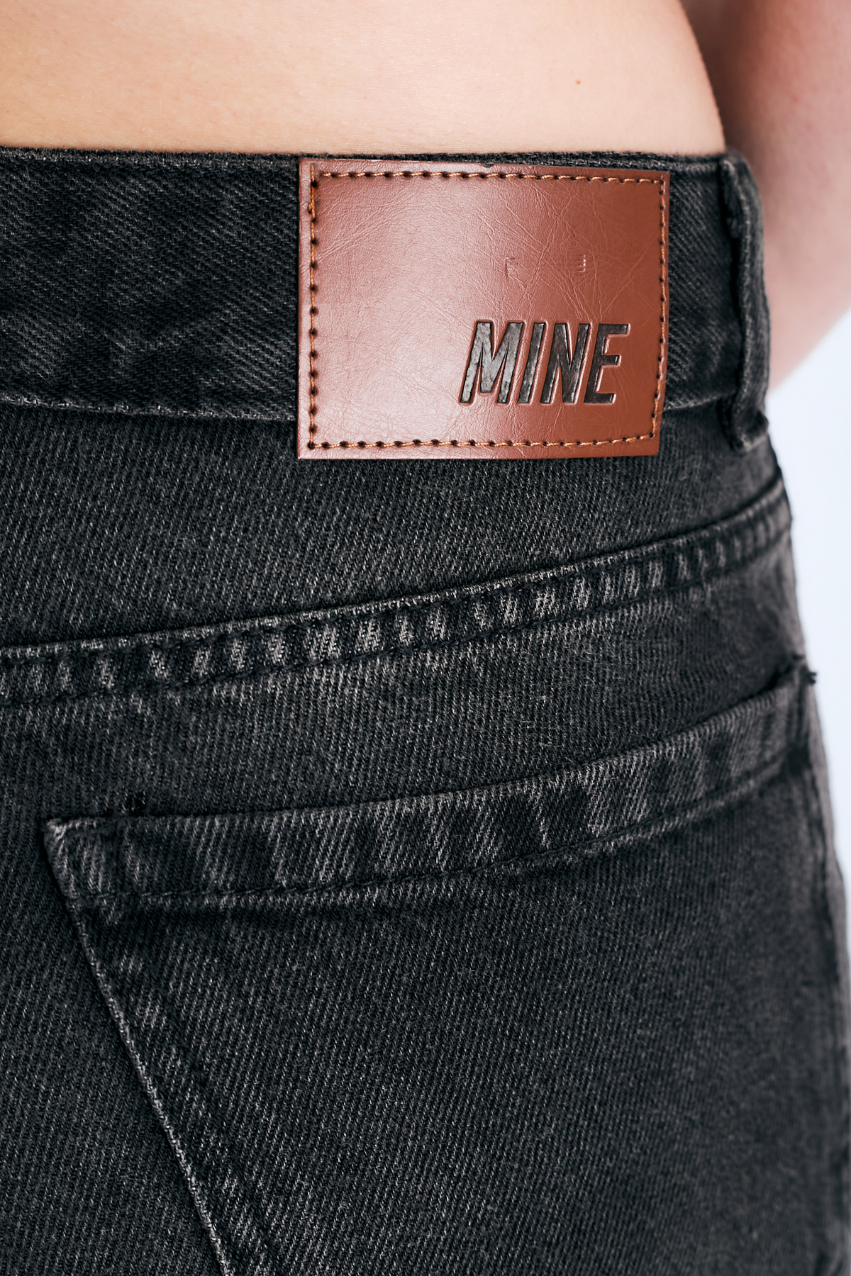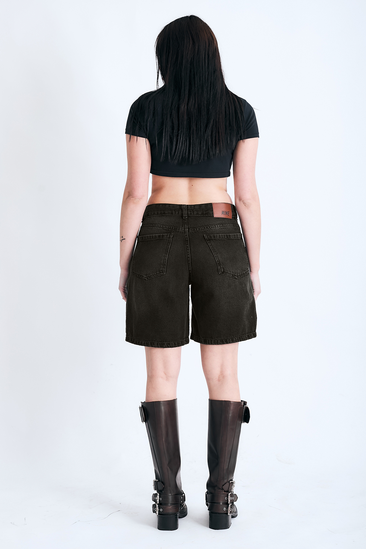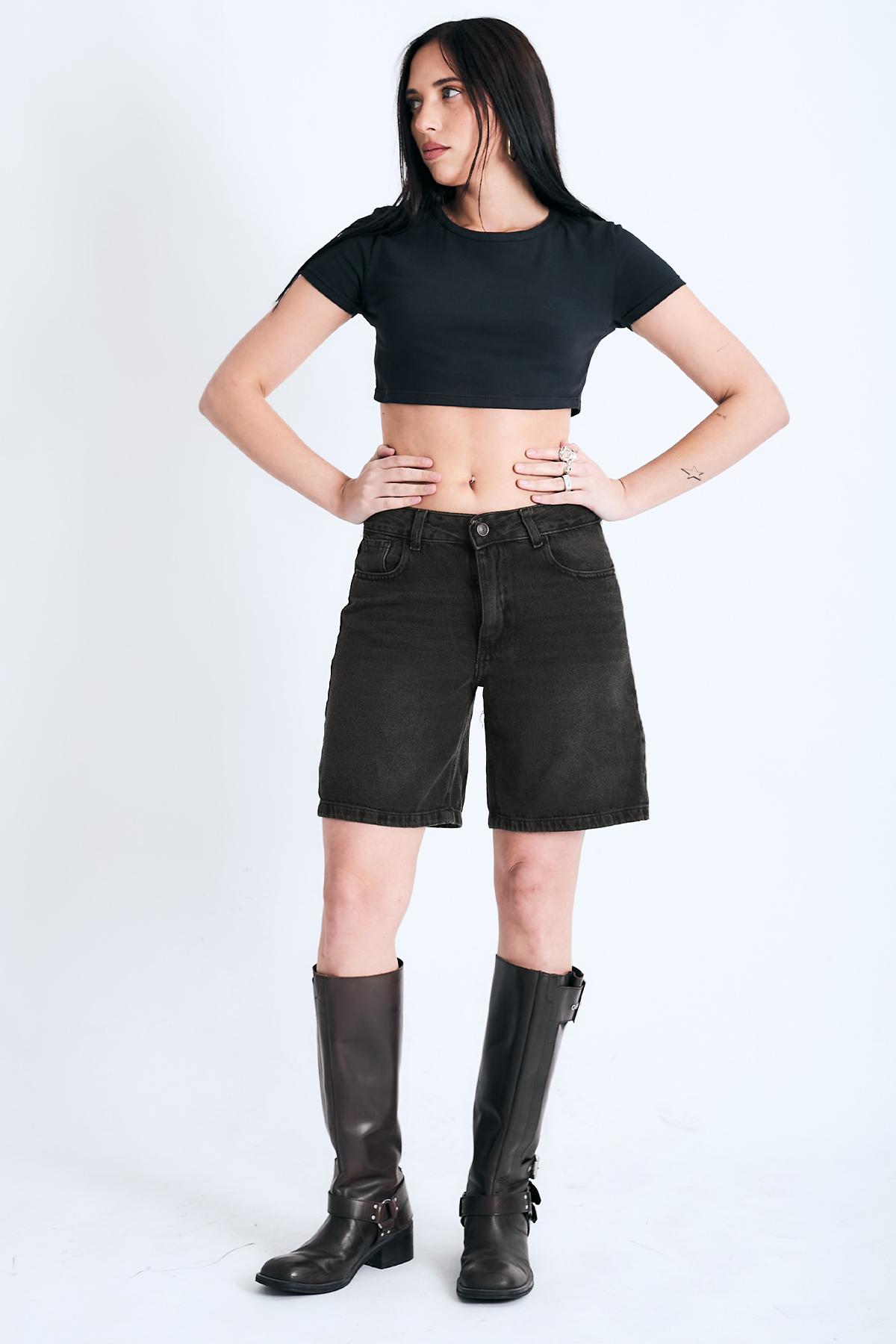 Bermuda clásica negra rígido con localizado y bigotes, tiro medio.