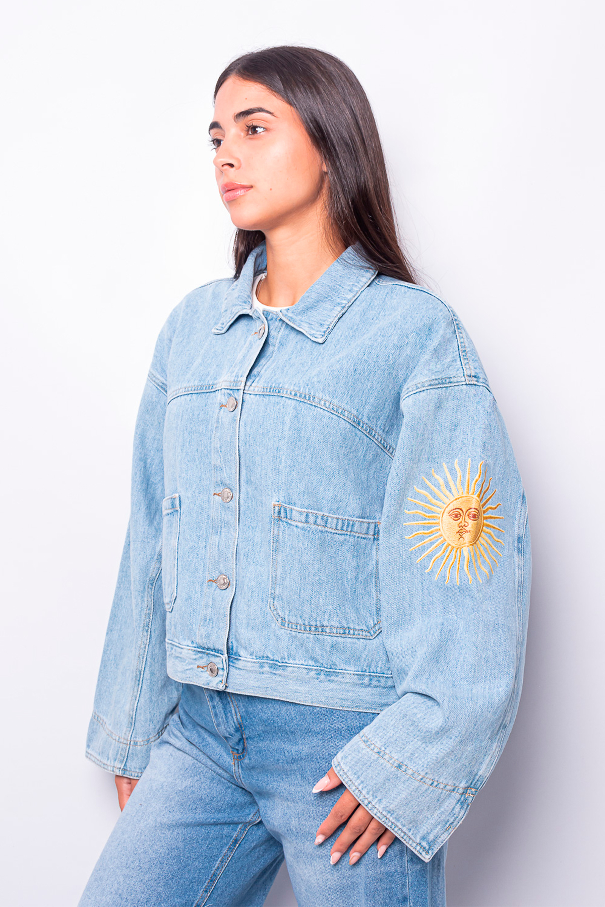 Campera oversize celeste rígida, con bolsillos plaqué en el frente y estampa de sol en la manga.