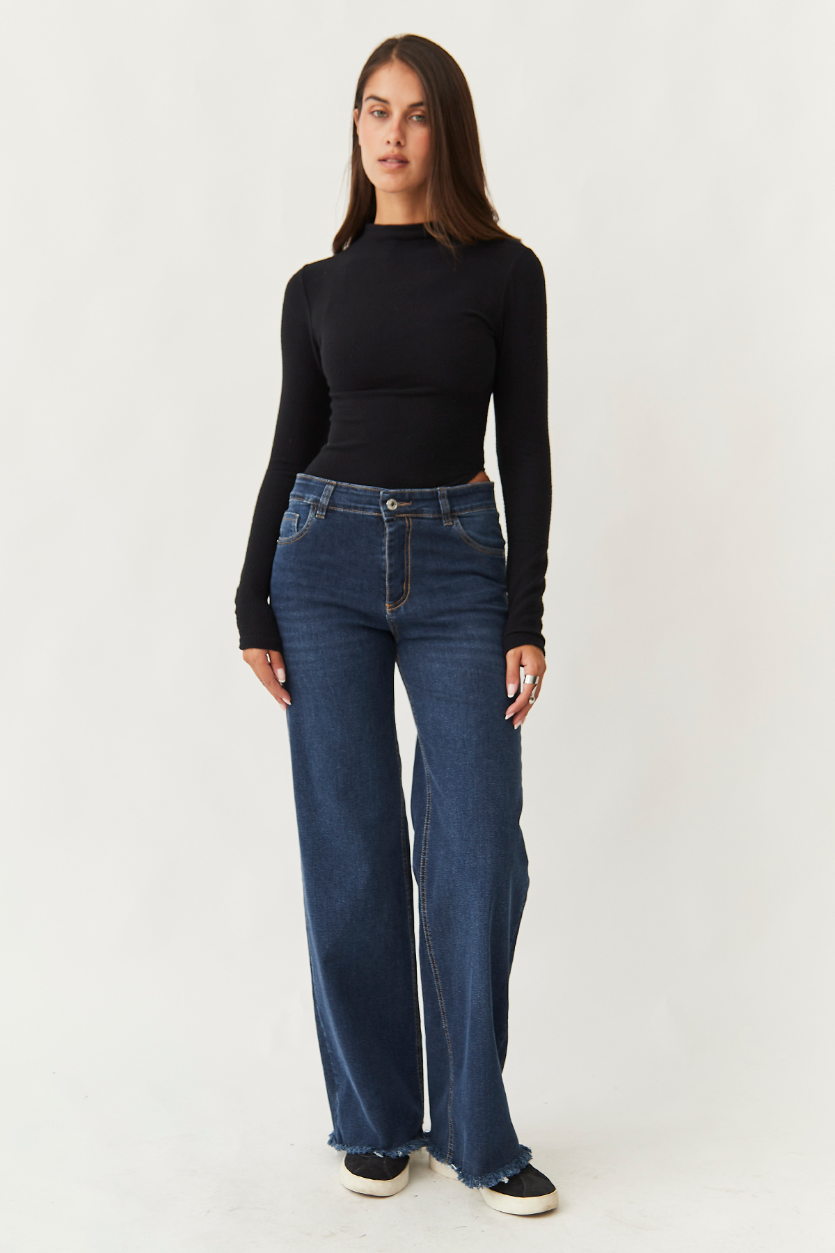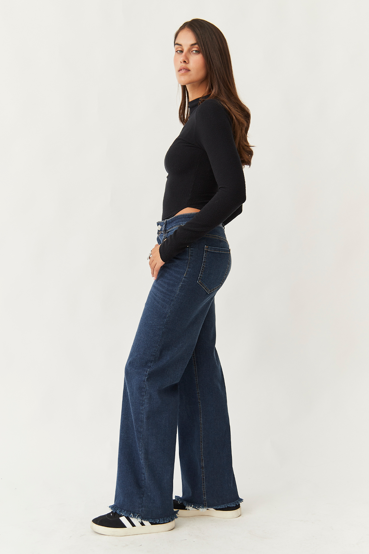 Pantalón wide leg elastizado azul stone con localizado y bigotes, tiro alto.