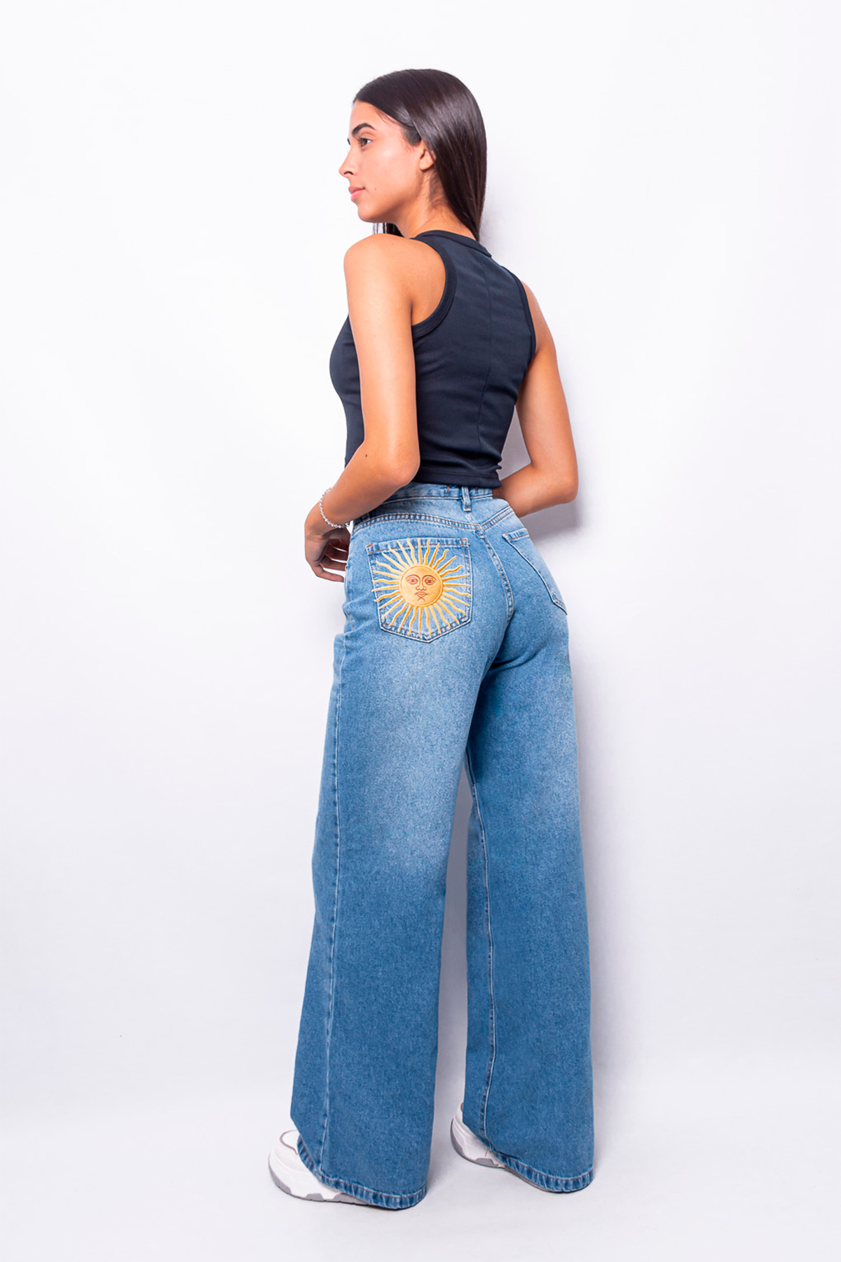 Pantalón wide leg rígido celeste con localizado con estampa de sol en la espalda, tiro medio.