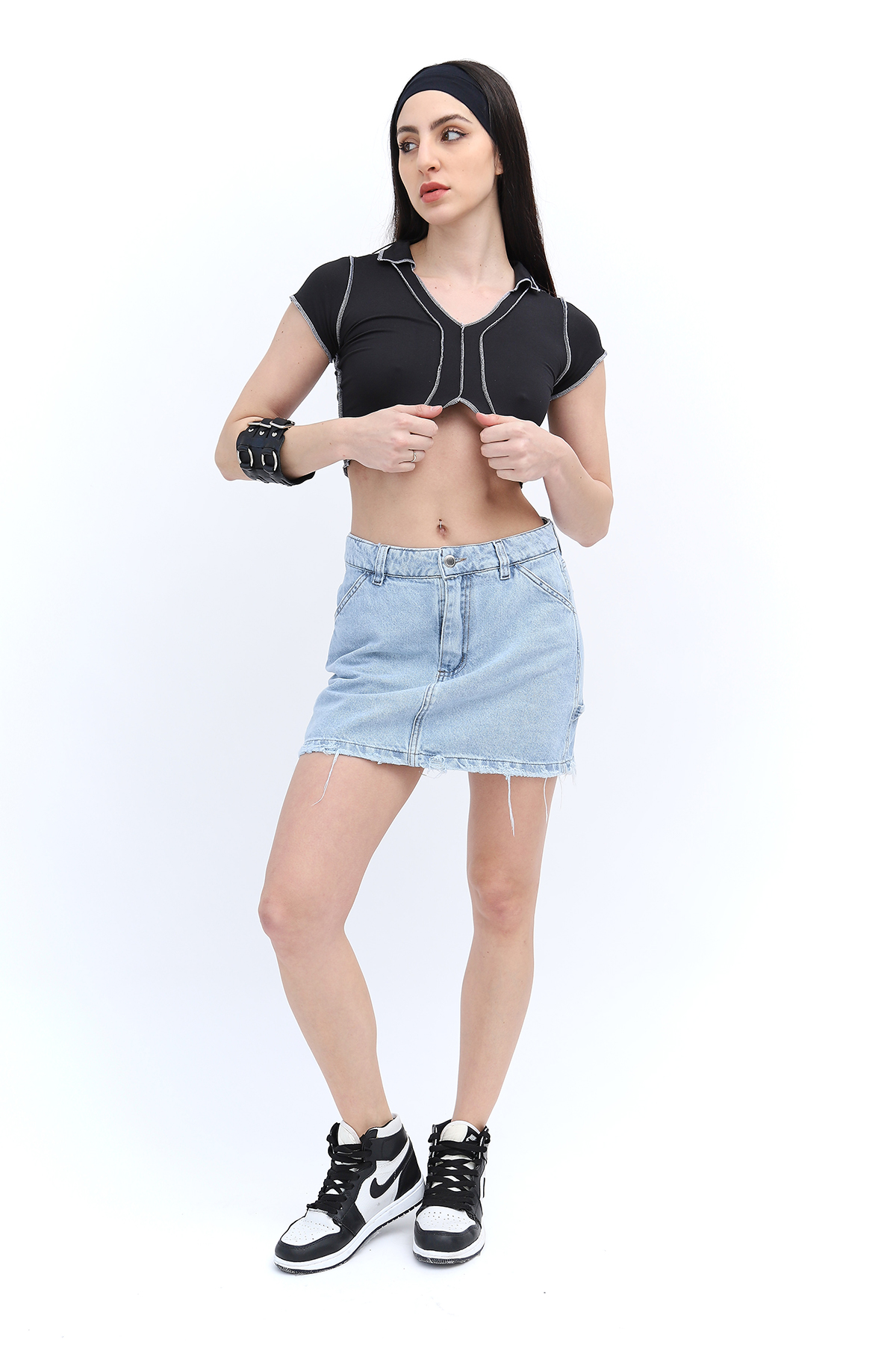 Mini de denim rígido celeste carpintero con roturas en la botamanga.