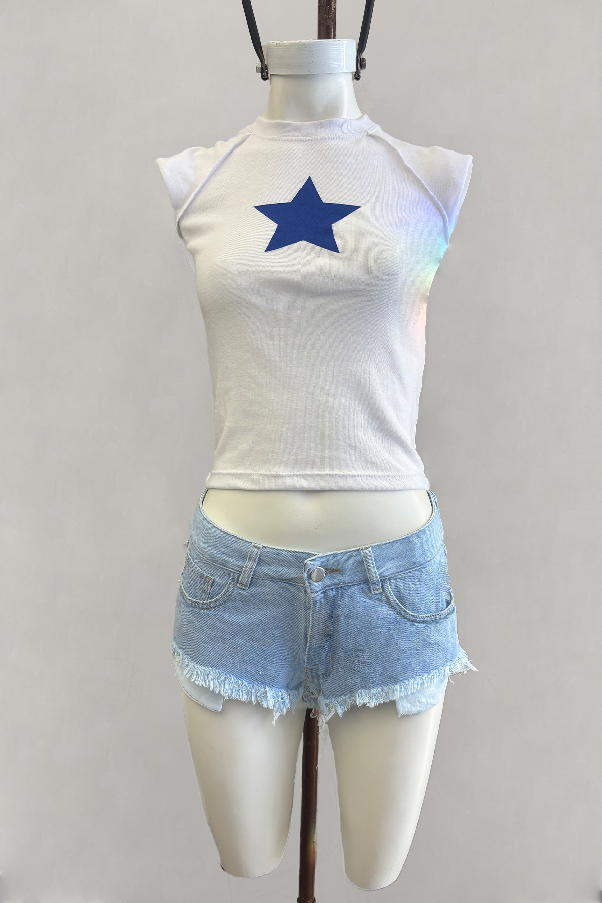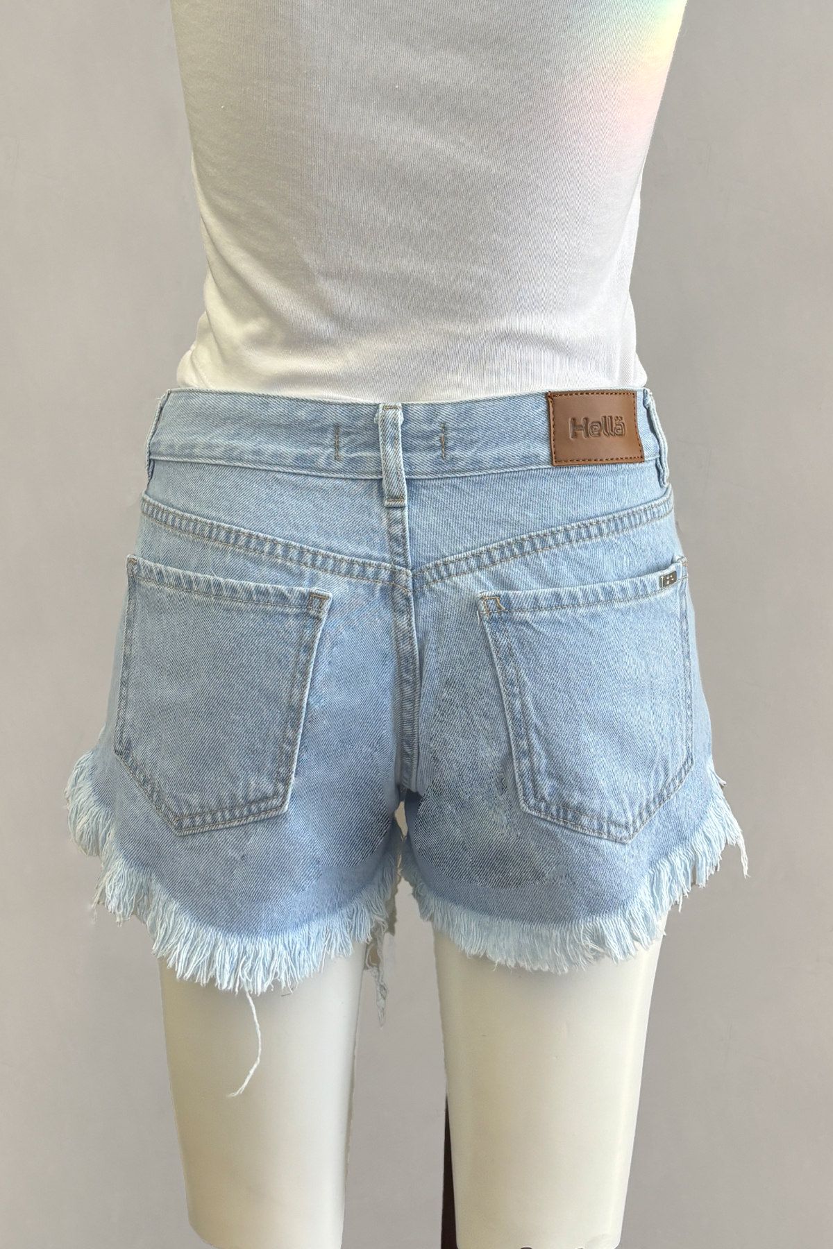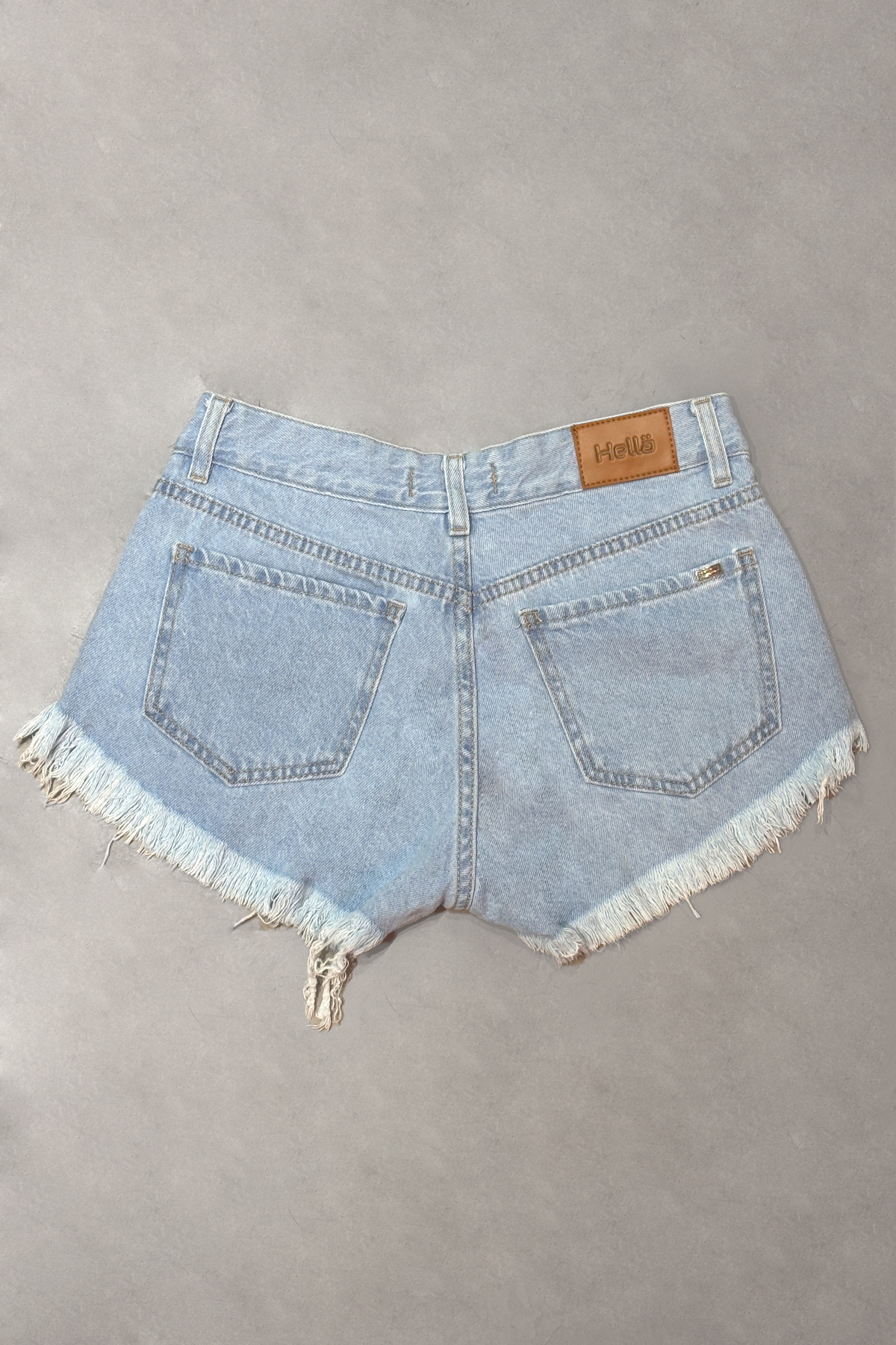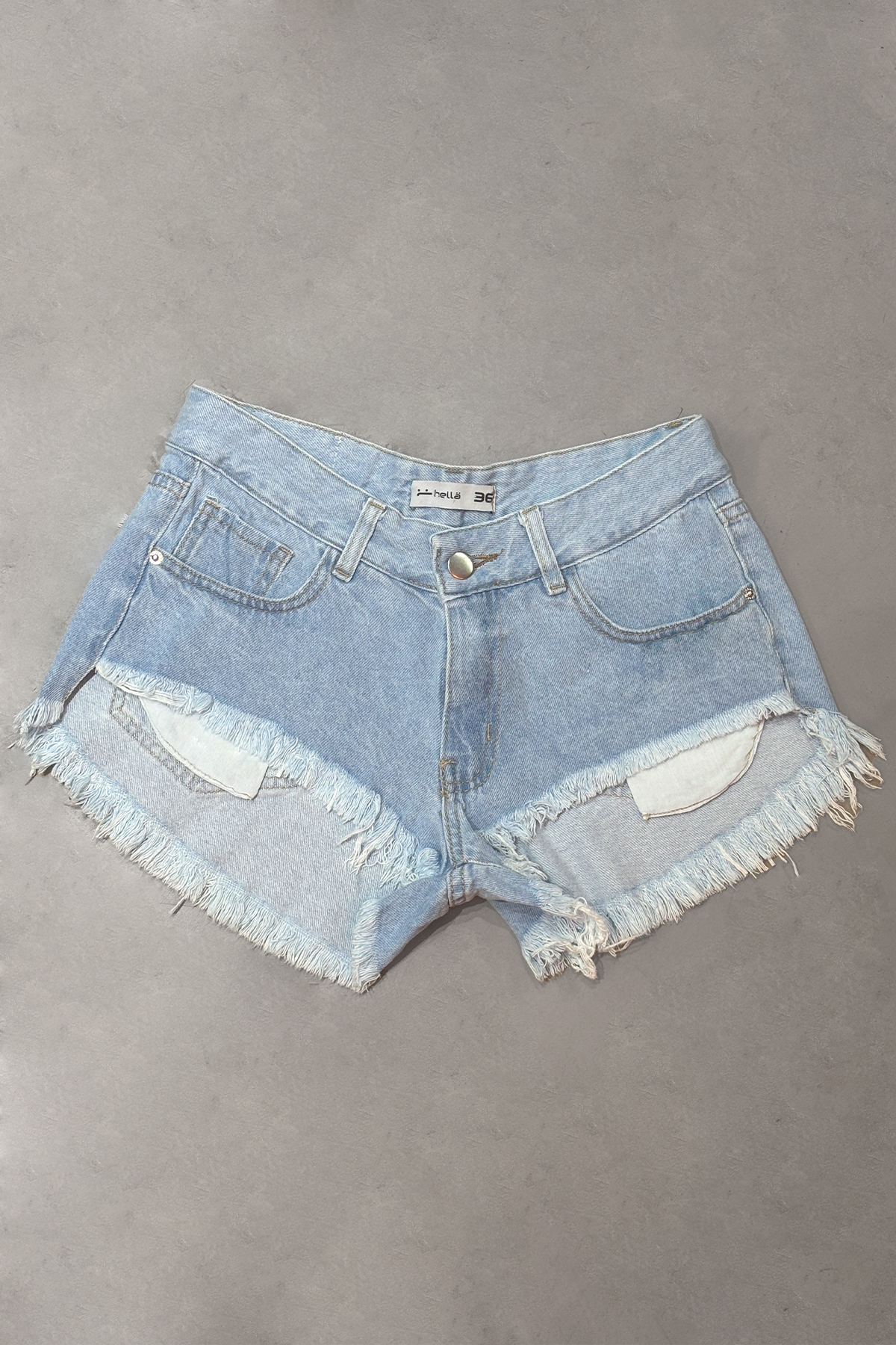 Short rígido celeste claro cavado con bolsillos largos, tiro bajo.