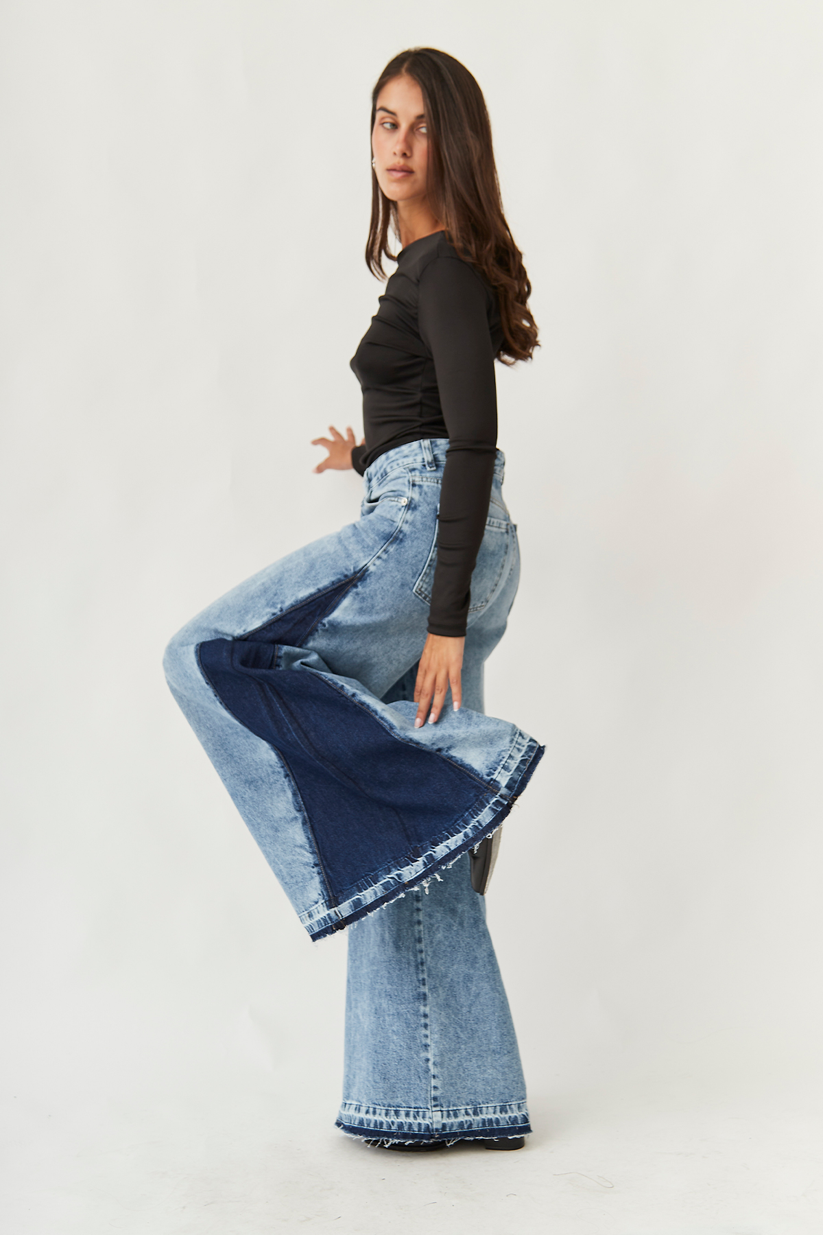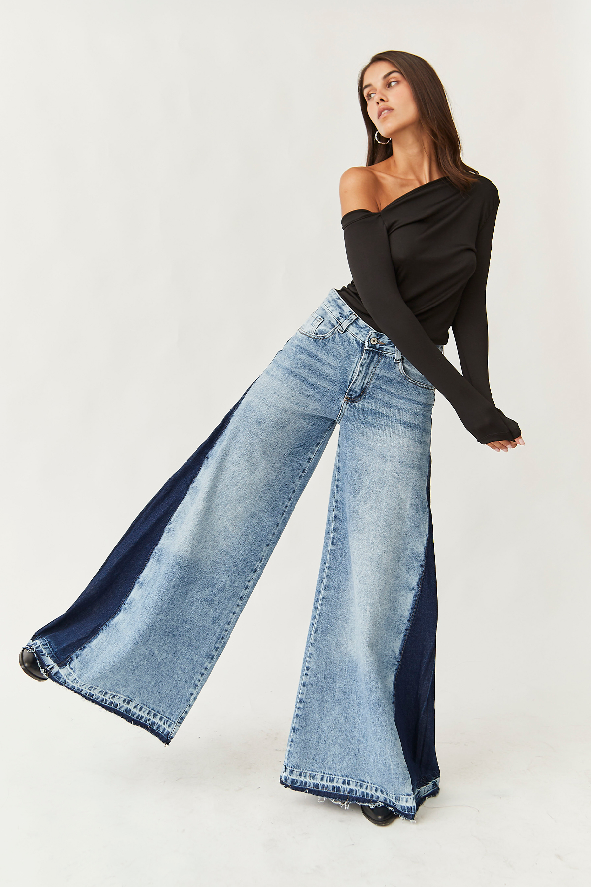 Pantalón maxi wide leg rígido con recorte, desflecado, tiro medio.