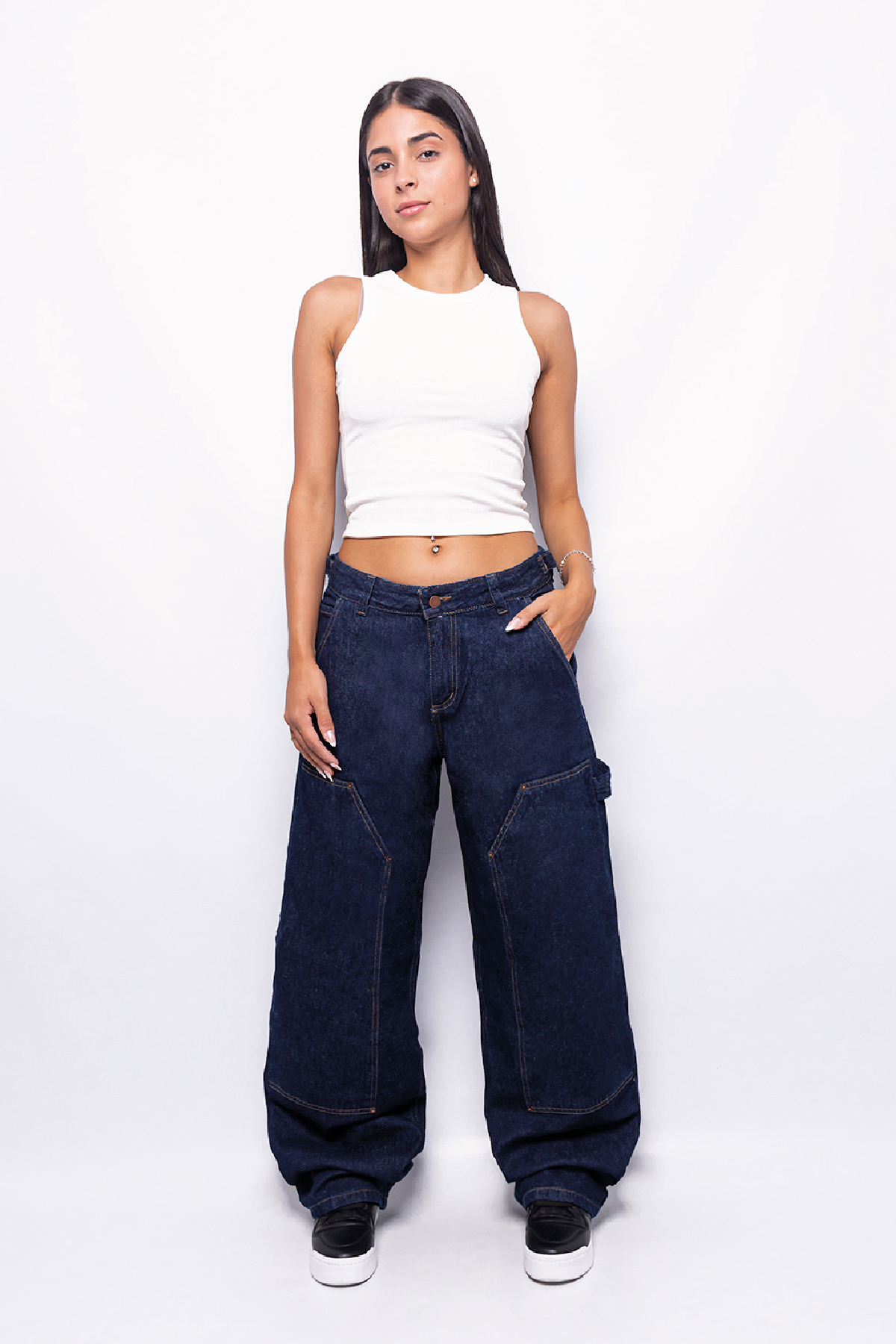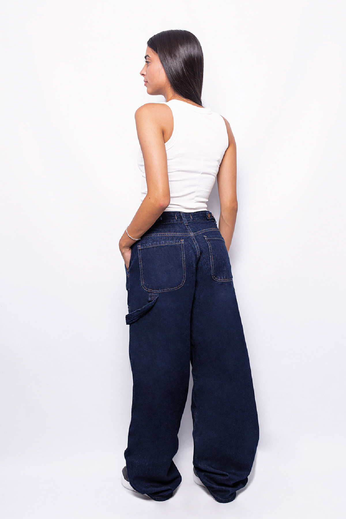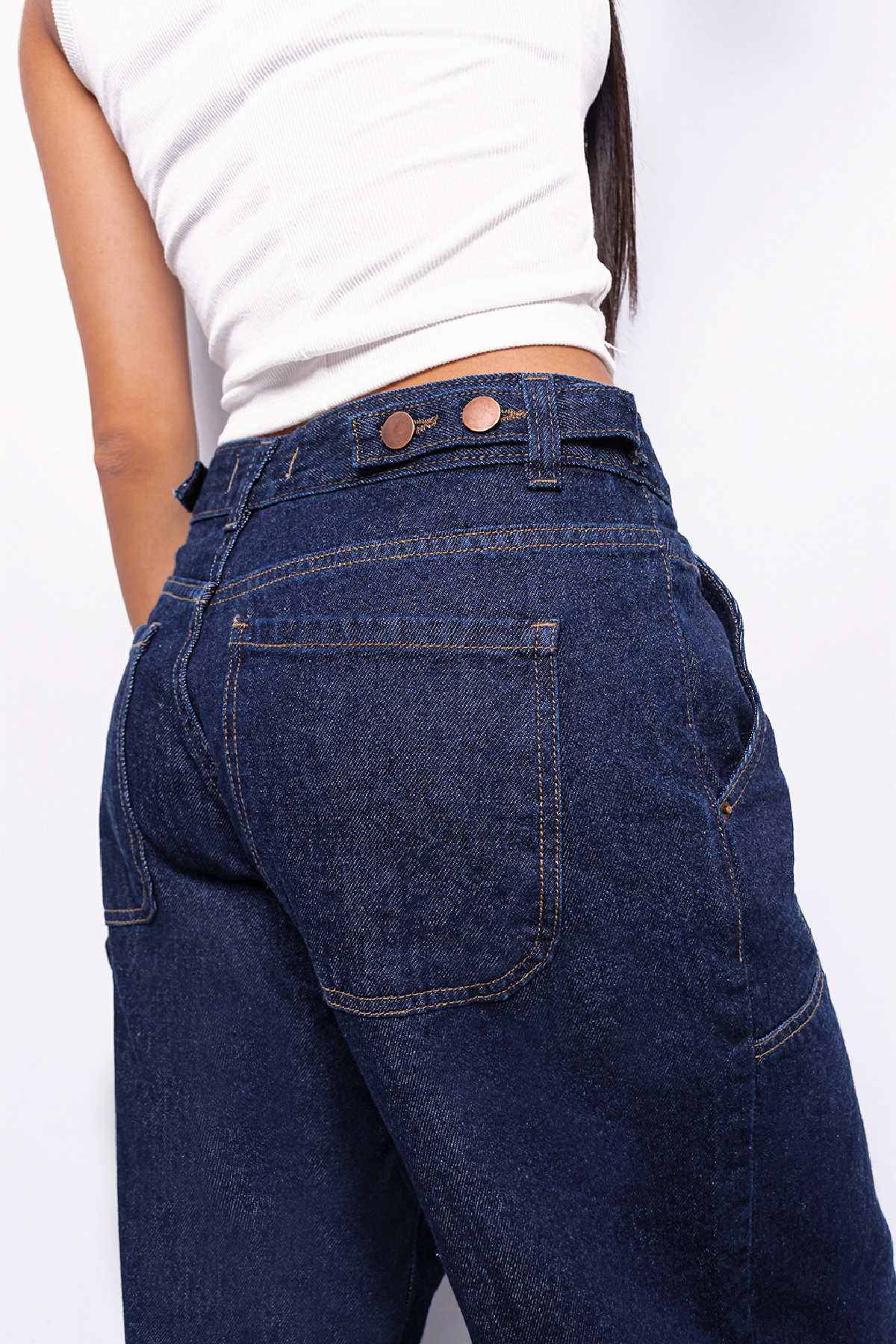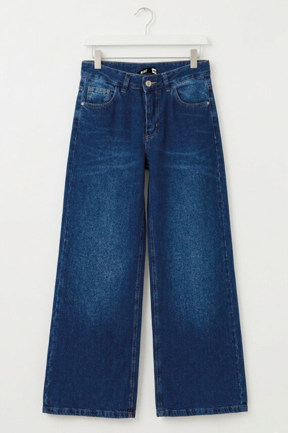 Pantalón baggy rígido azul suavizado con botones en la cintura, tiro medio.