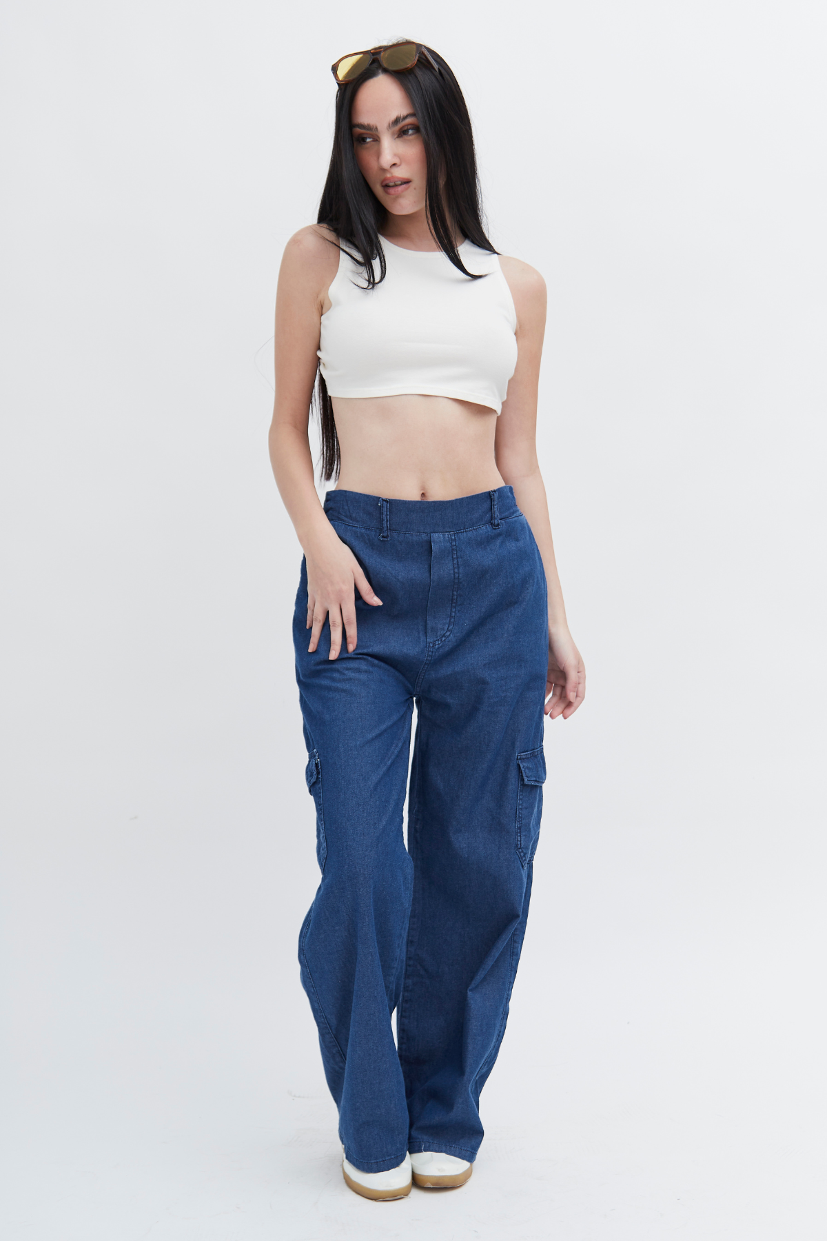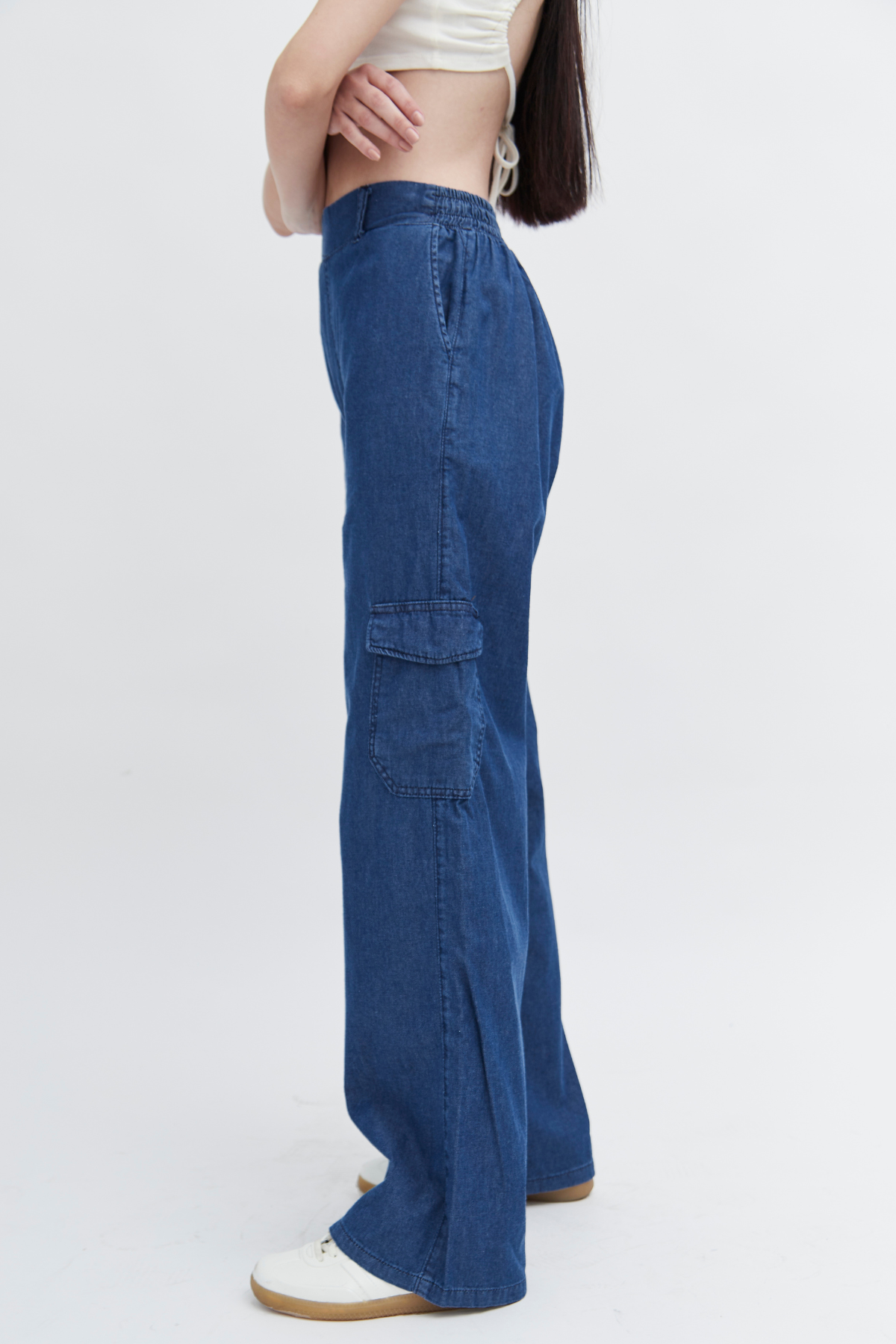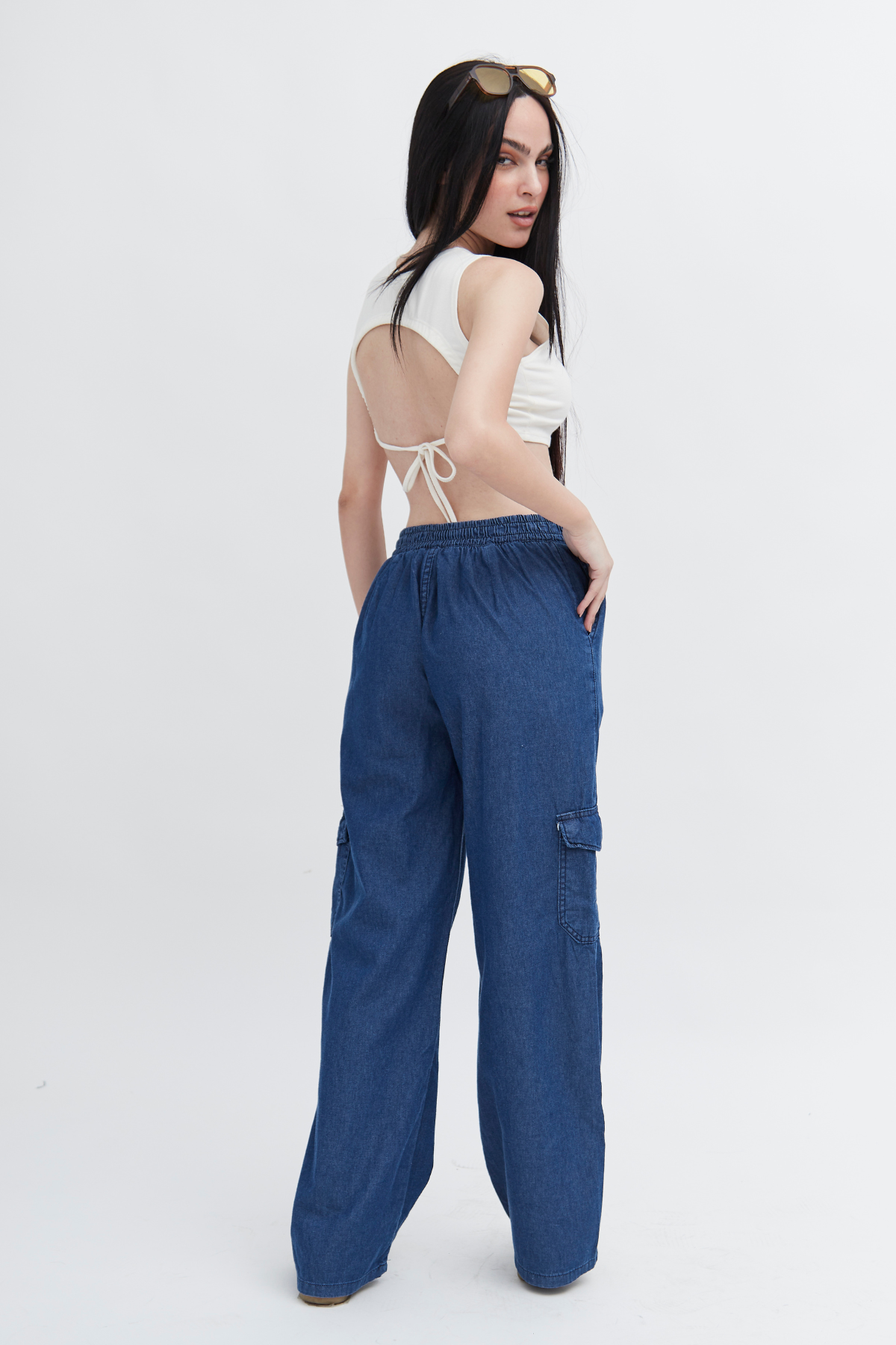Cargo rígido camisero azul con elástico en la mitad de cintura.