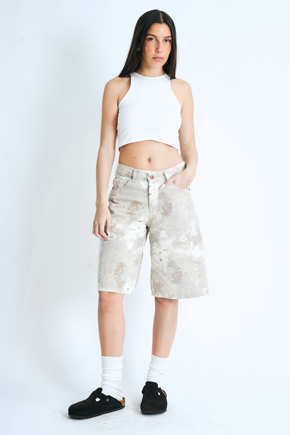 Bermuda amplia de gabardina rígida estampada beige, tiro bajo.