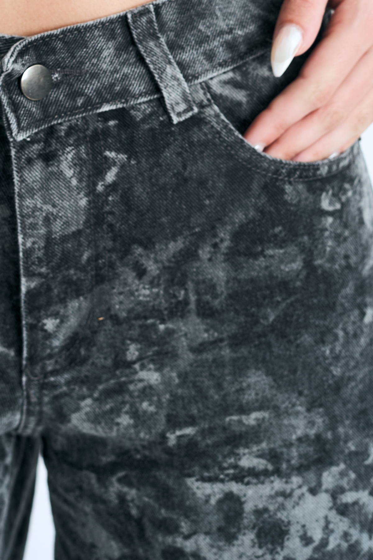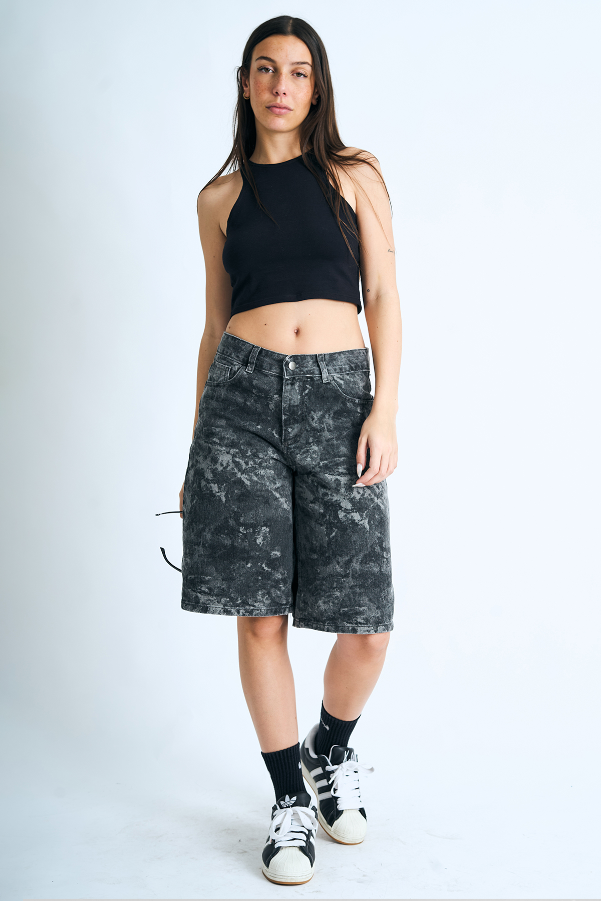 Bermuda amplia de gabardina rígida estampada gris, tiro bajo.