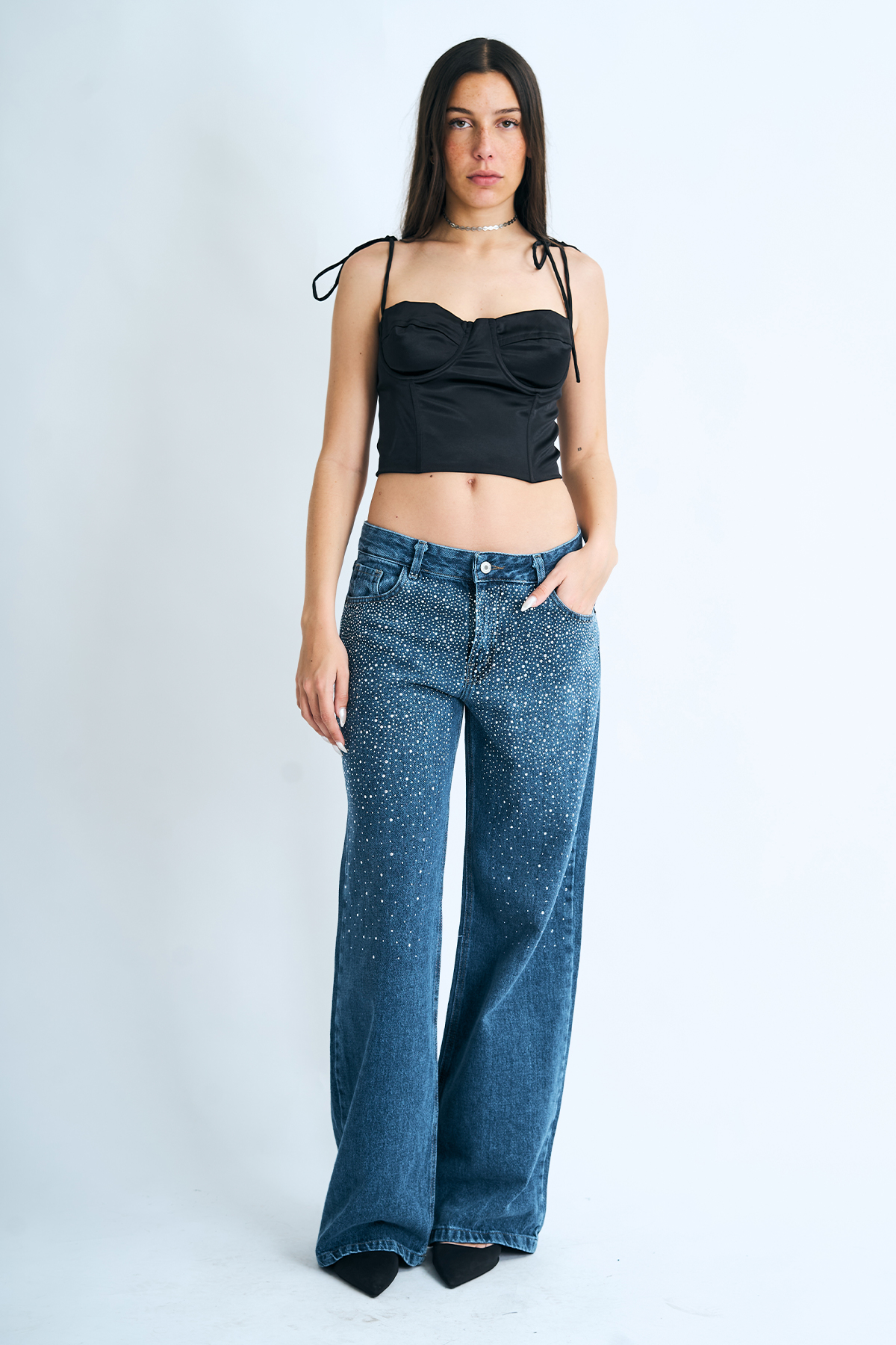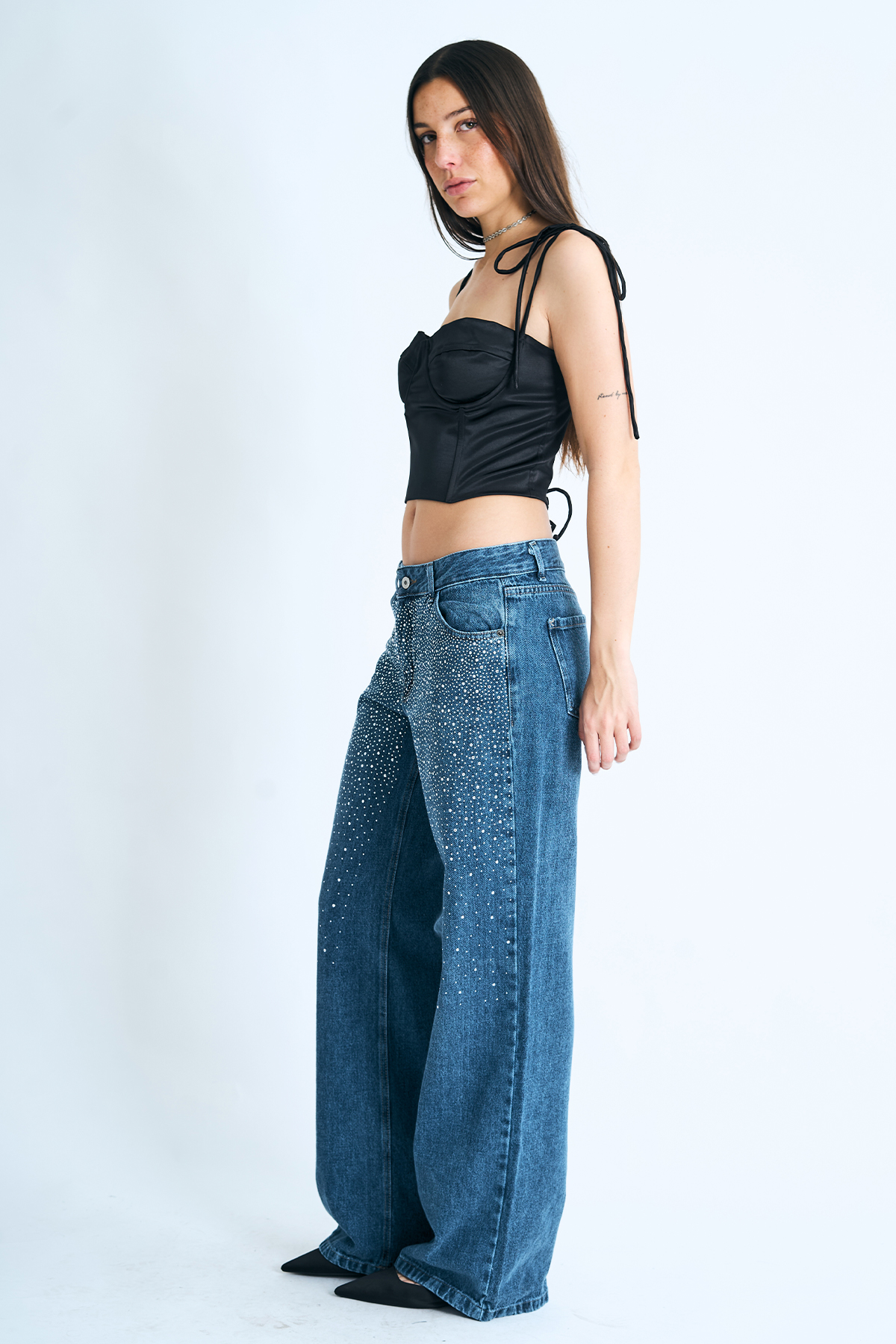 Pantalón wide leg rígido azul con localizado con strass en el frente, tiro bajo.
