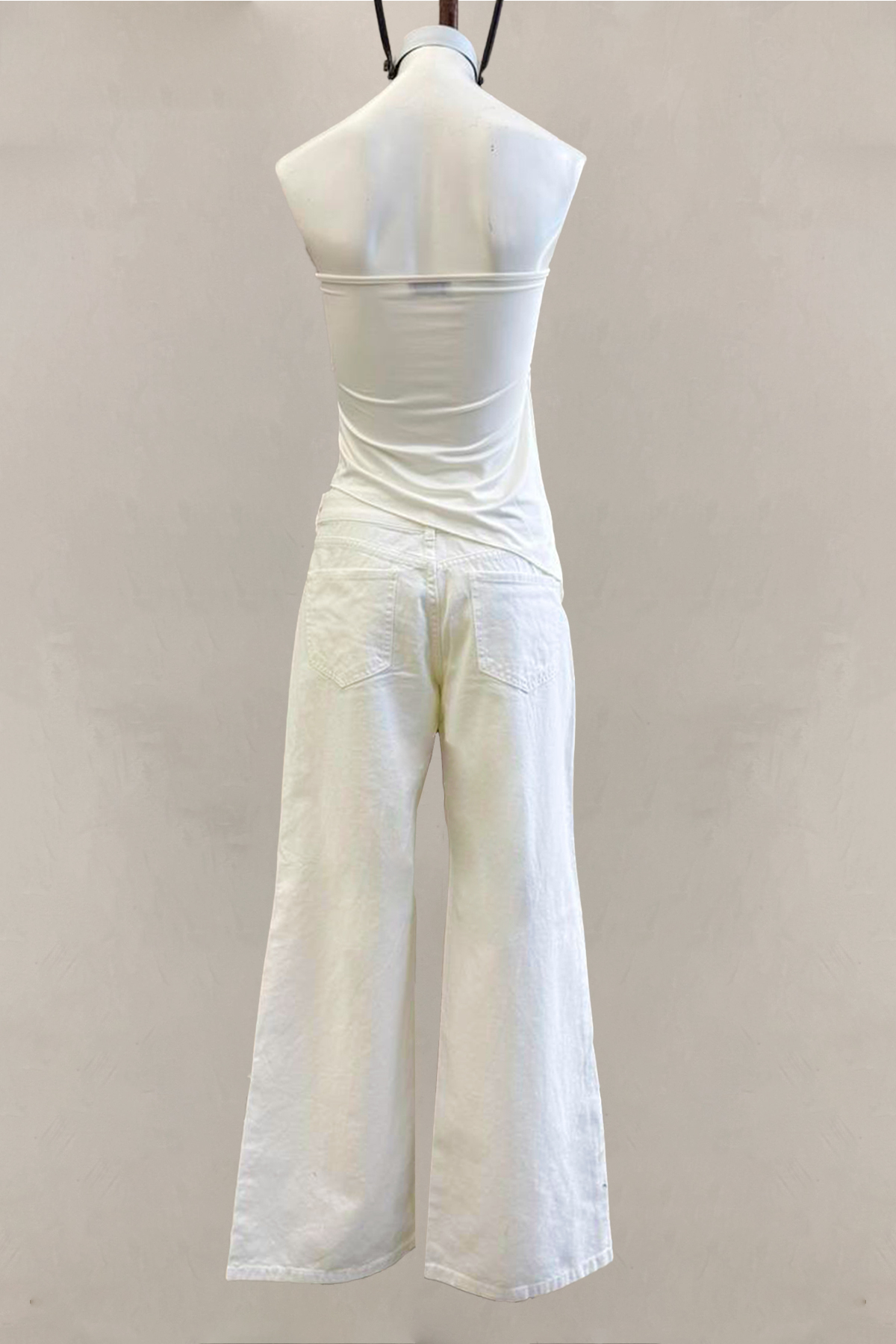 Pantalón wide leg rígido de gabardina blanco con strass en el frente, tiro medio.