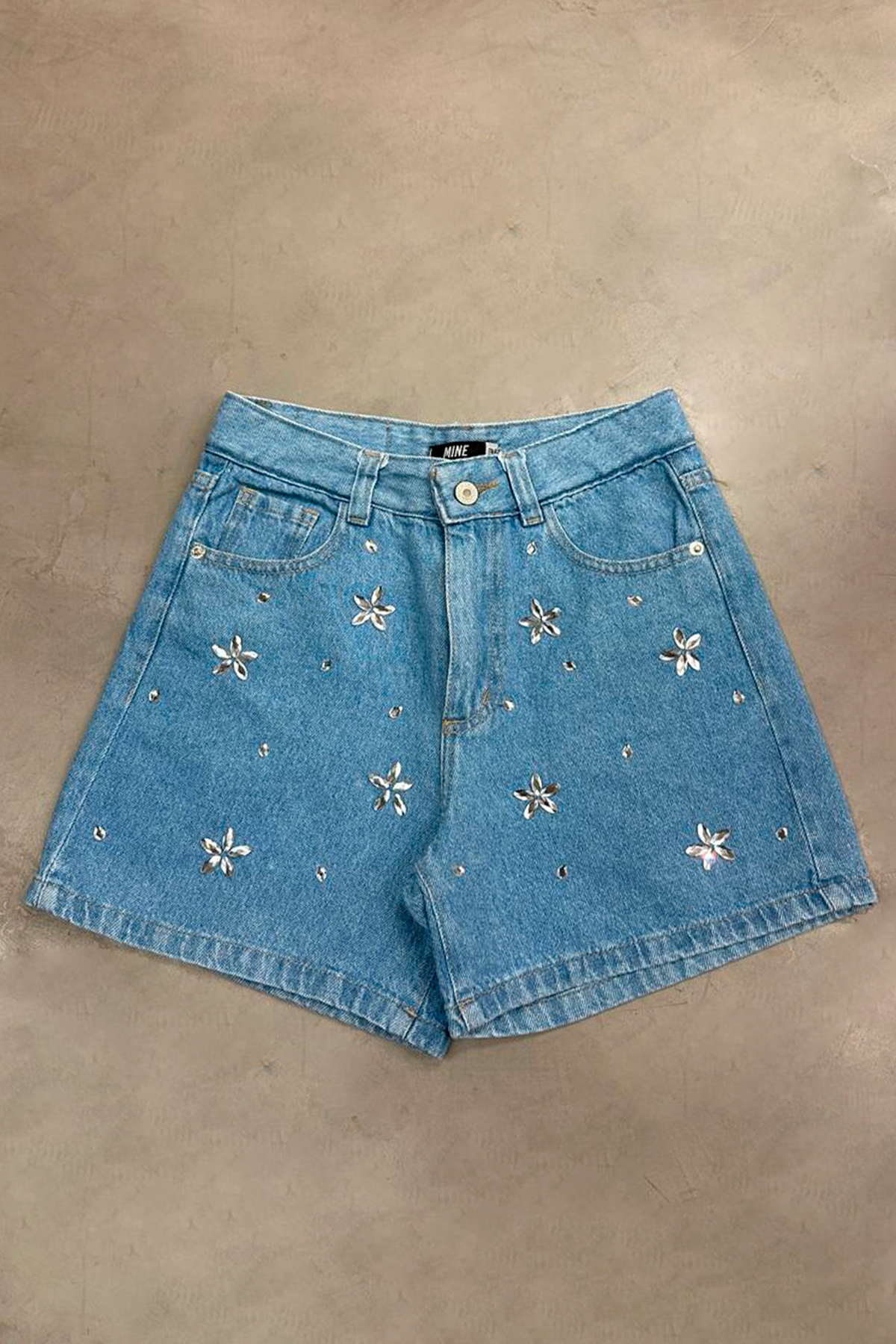 Short mom rígido celeste con piedras en el frente, tiro alto.