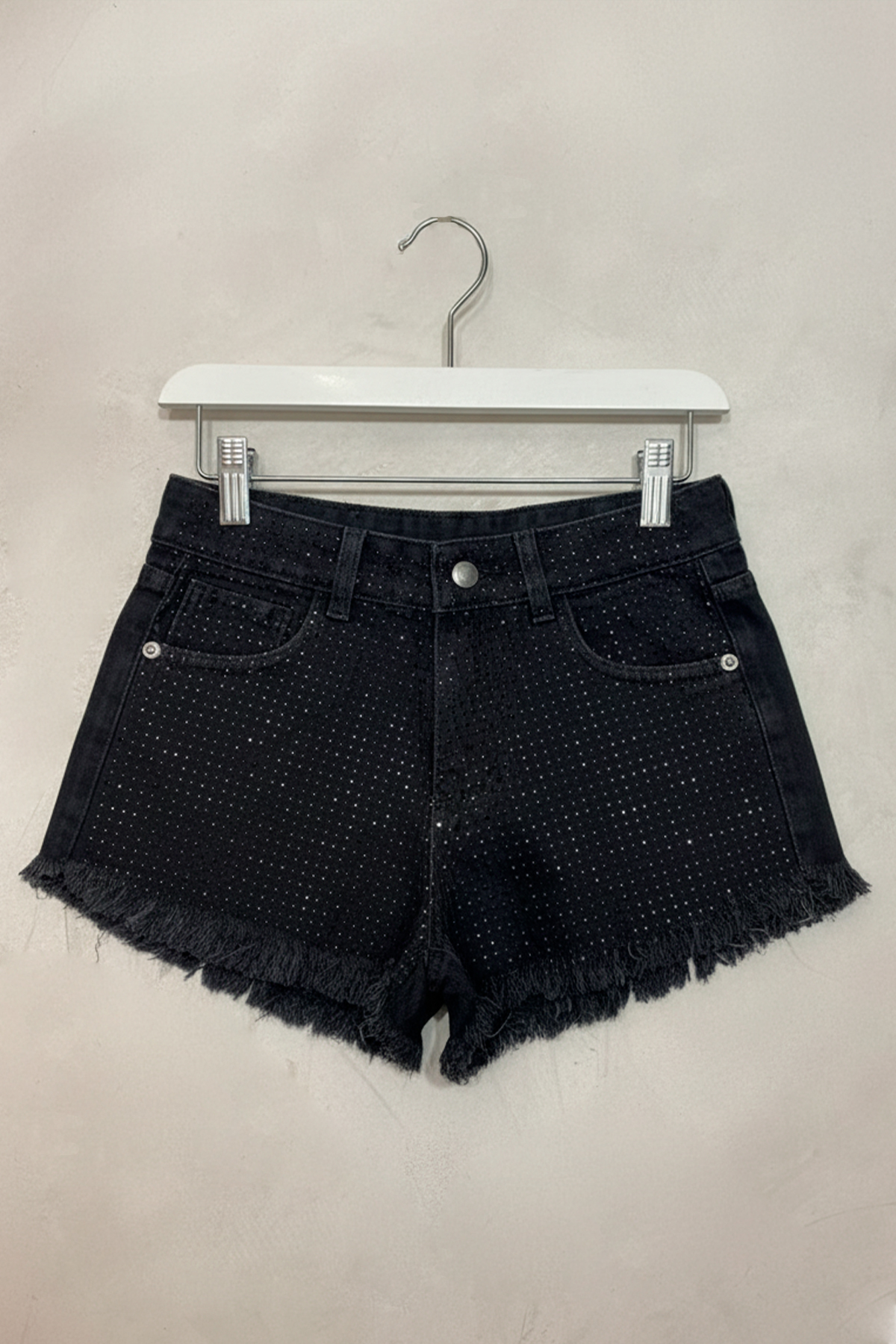 Short rígido desflecado negro con strass negro en el frente, tiro alto.