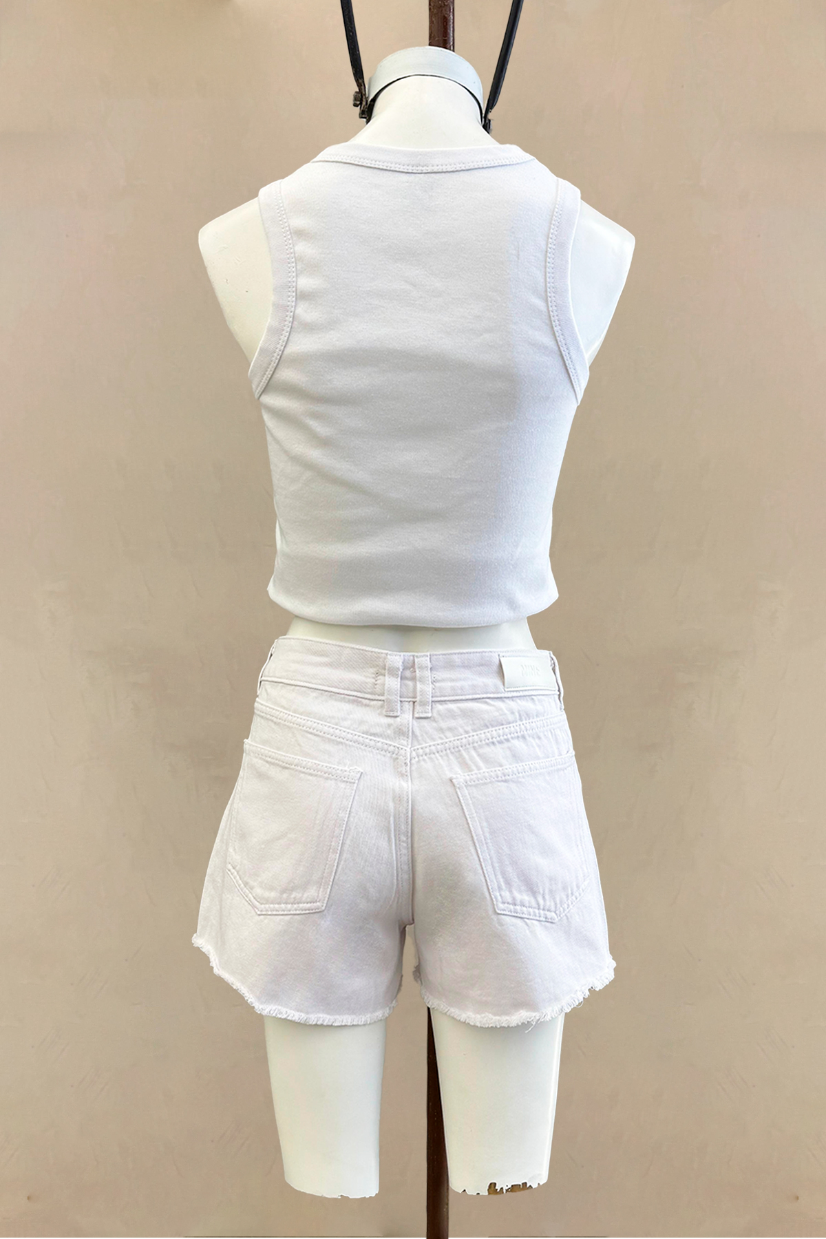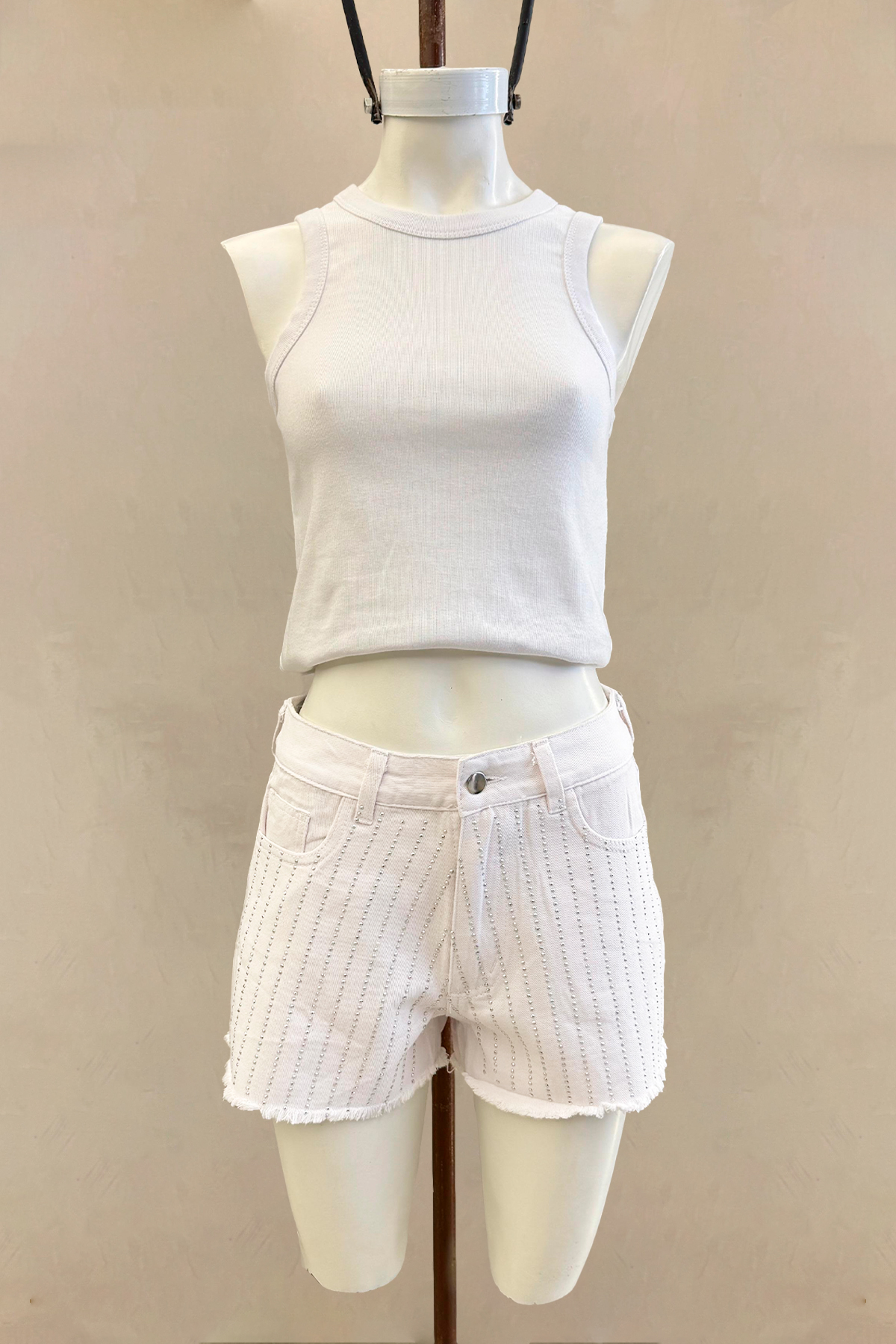 Short clásico blanco de gabardina rígida desflecado con strass rayado en el frente. Tiro alto.