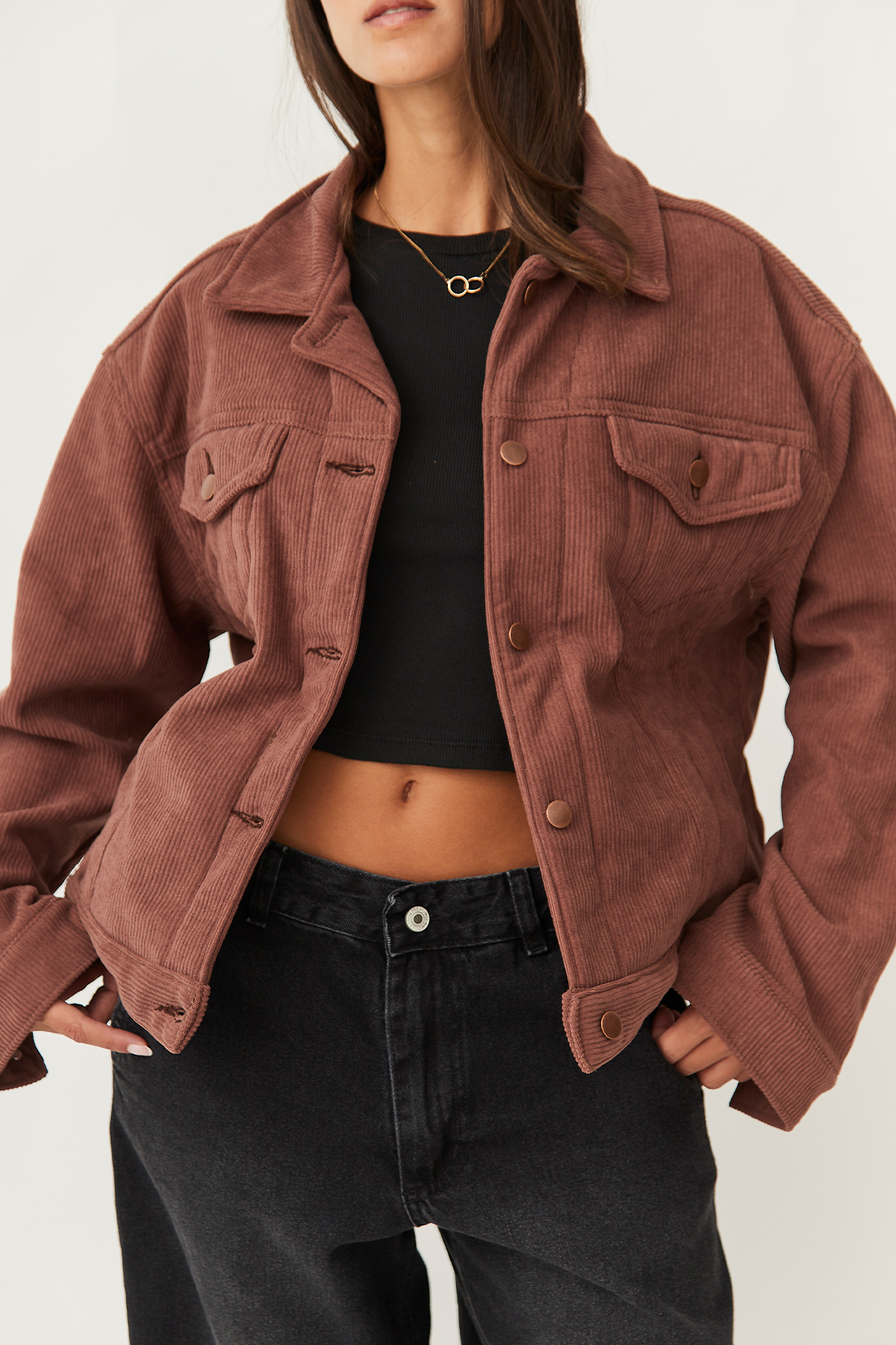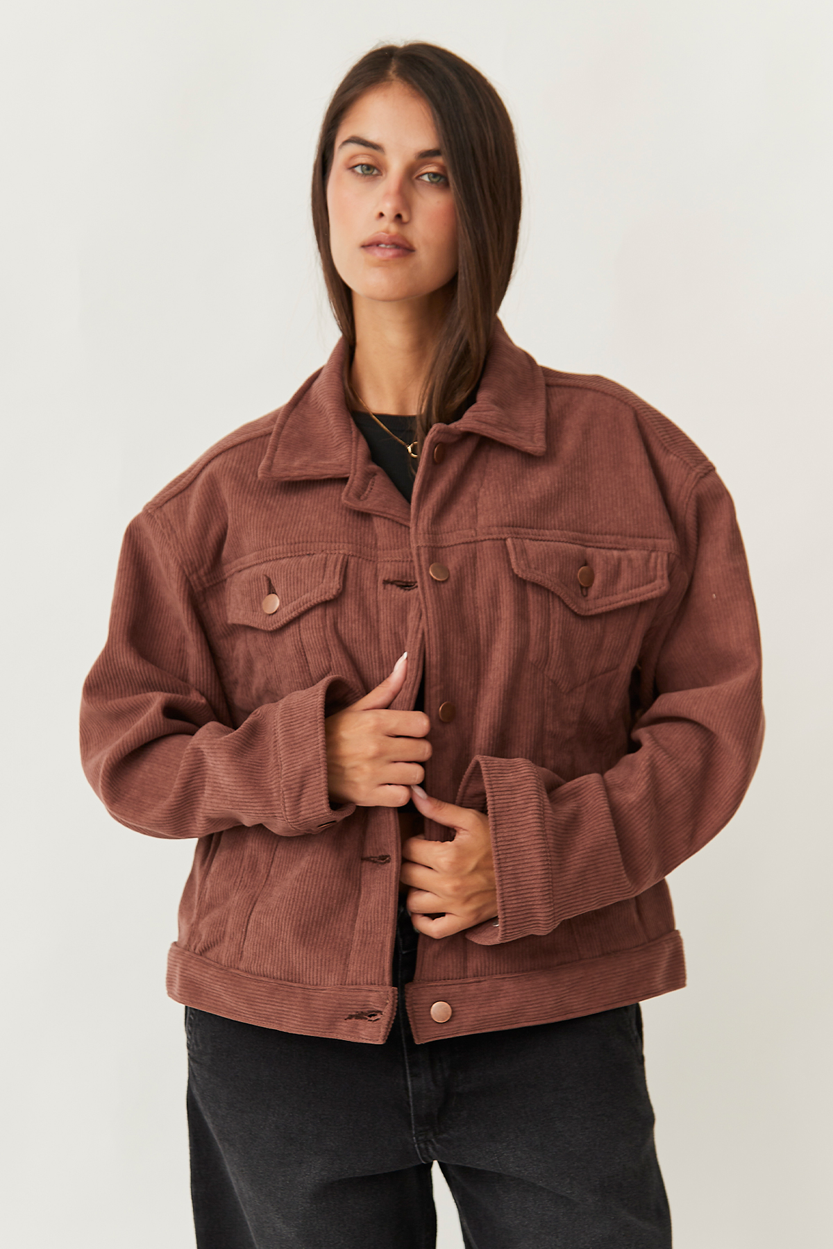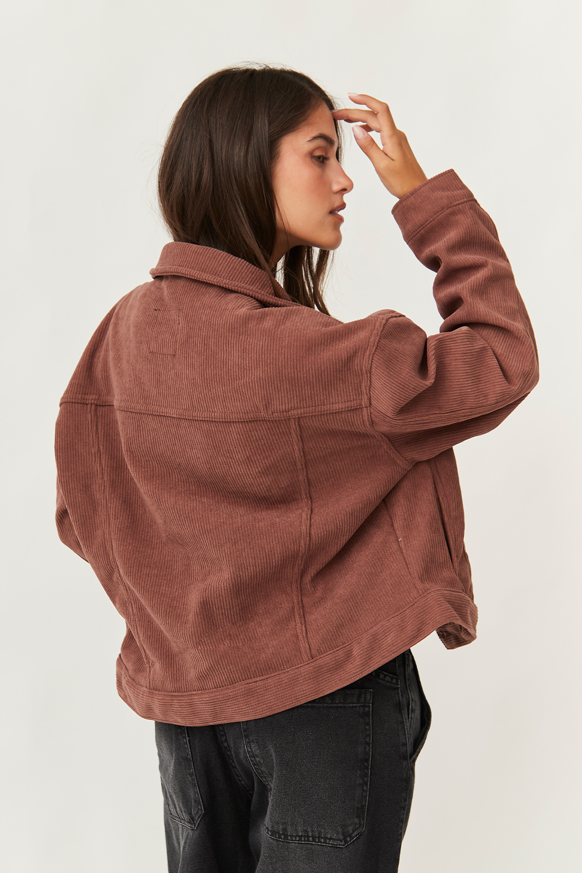Campera oversize rígida de corderoy bondeado chocolate.