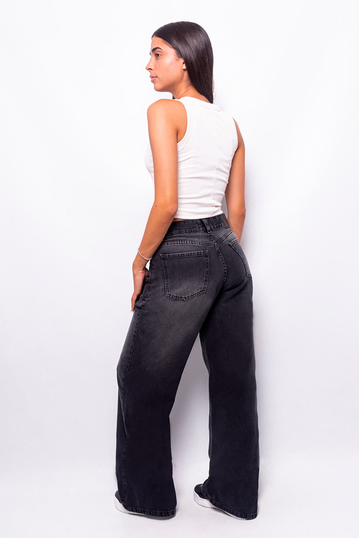 Pantalón wide leg rígido negro con localizado y bigote, tiro medio.