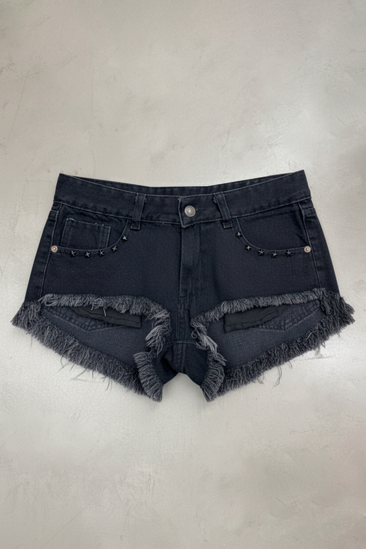 Short de jean negro cavado desflecado rígido con tachas de estrellas en los bolsillos delanteros, tiro bajo.