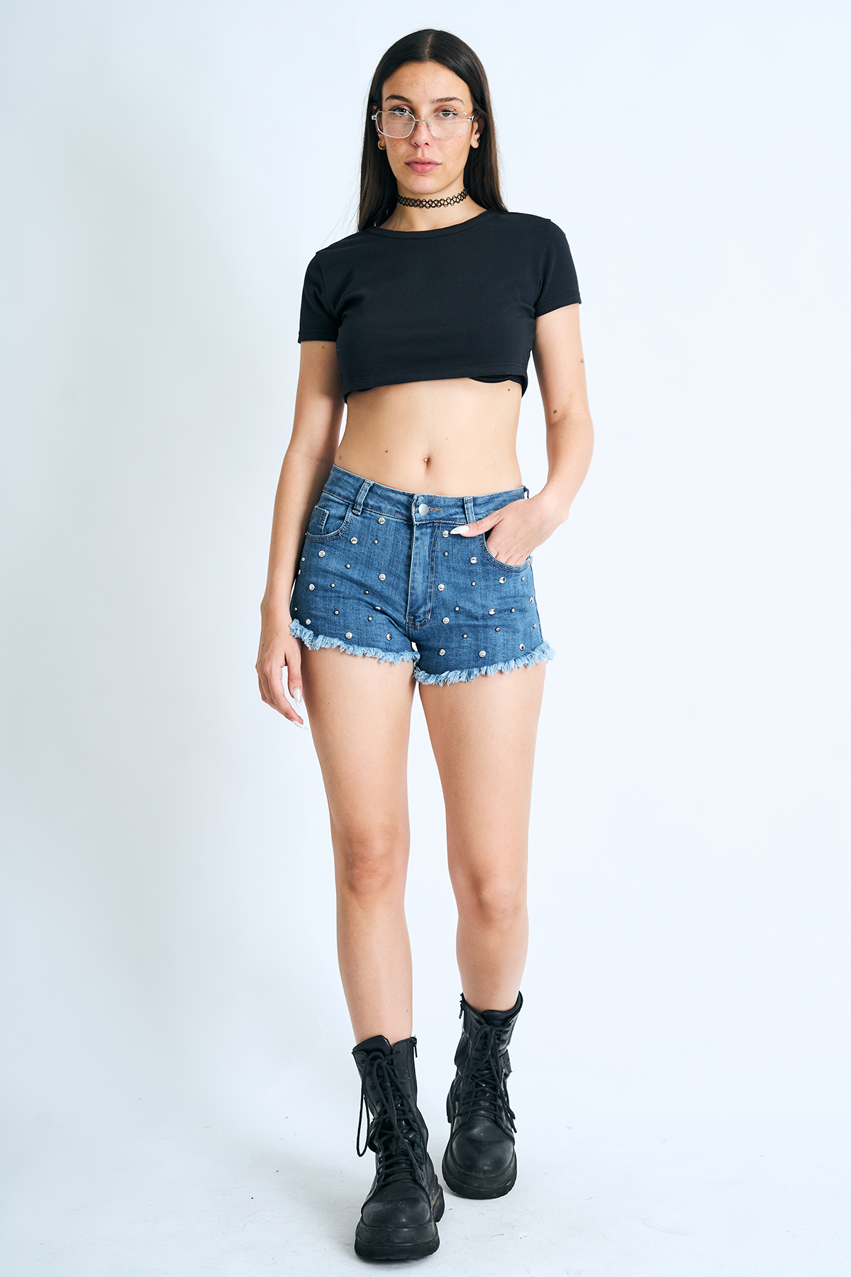 Short elastizado desflecado azul stone con tachas en el frente y en la espalda, tiro medio.