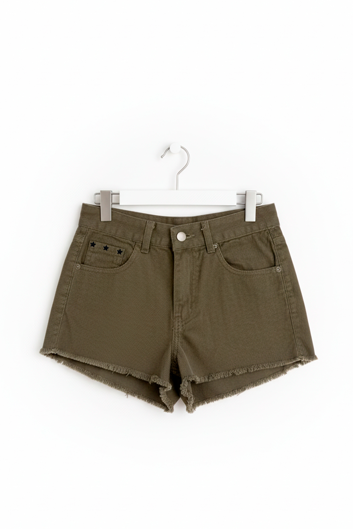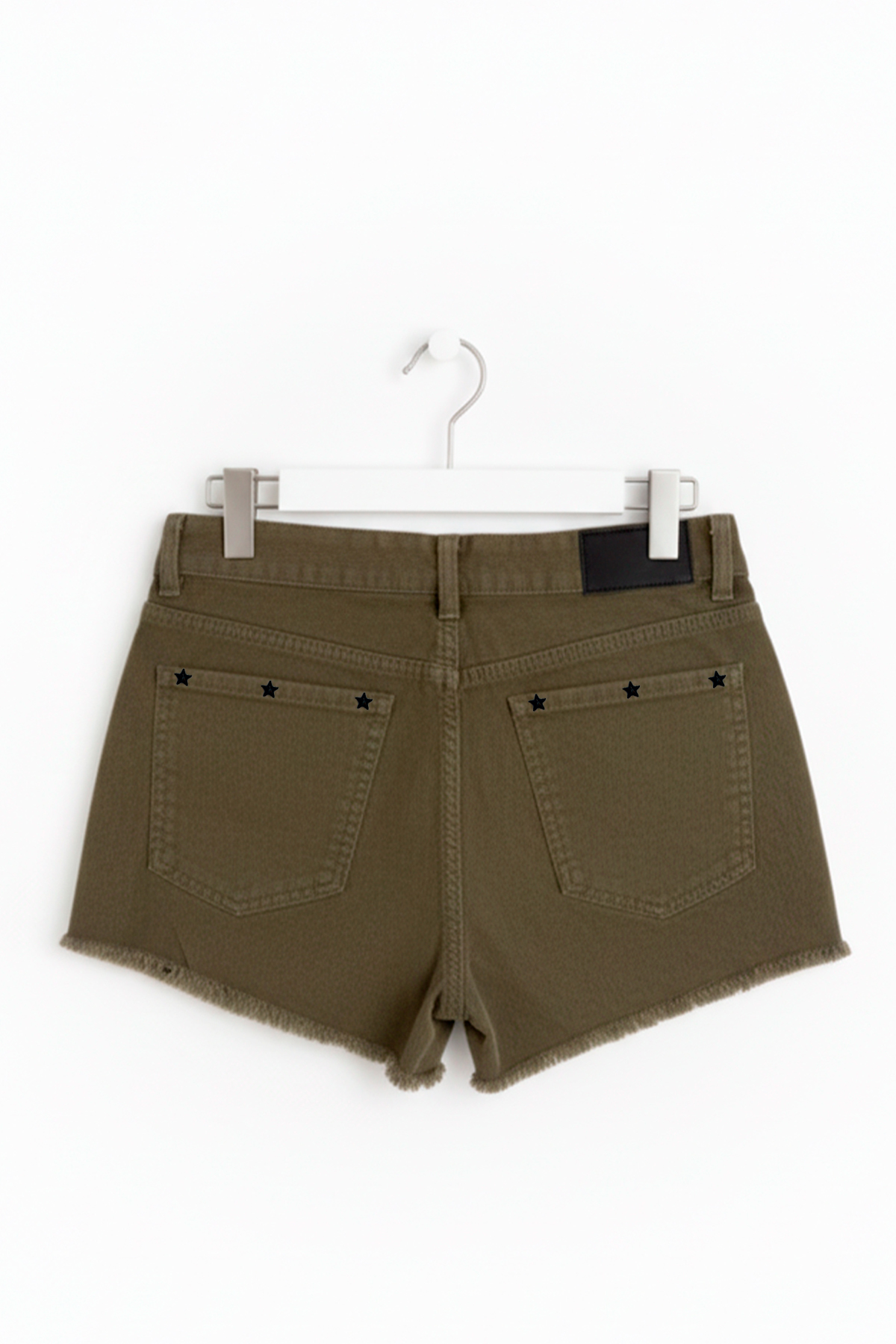 Short clásico de gabardina rígida desflecado verde militar con tachas de estrellas. Tiro medio.