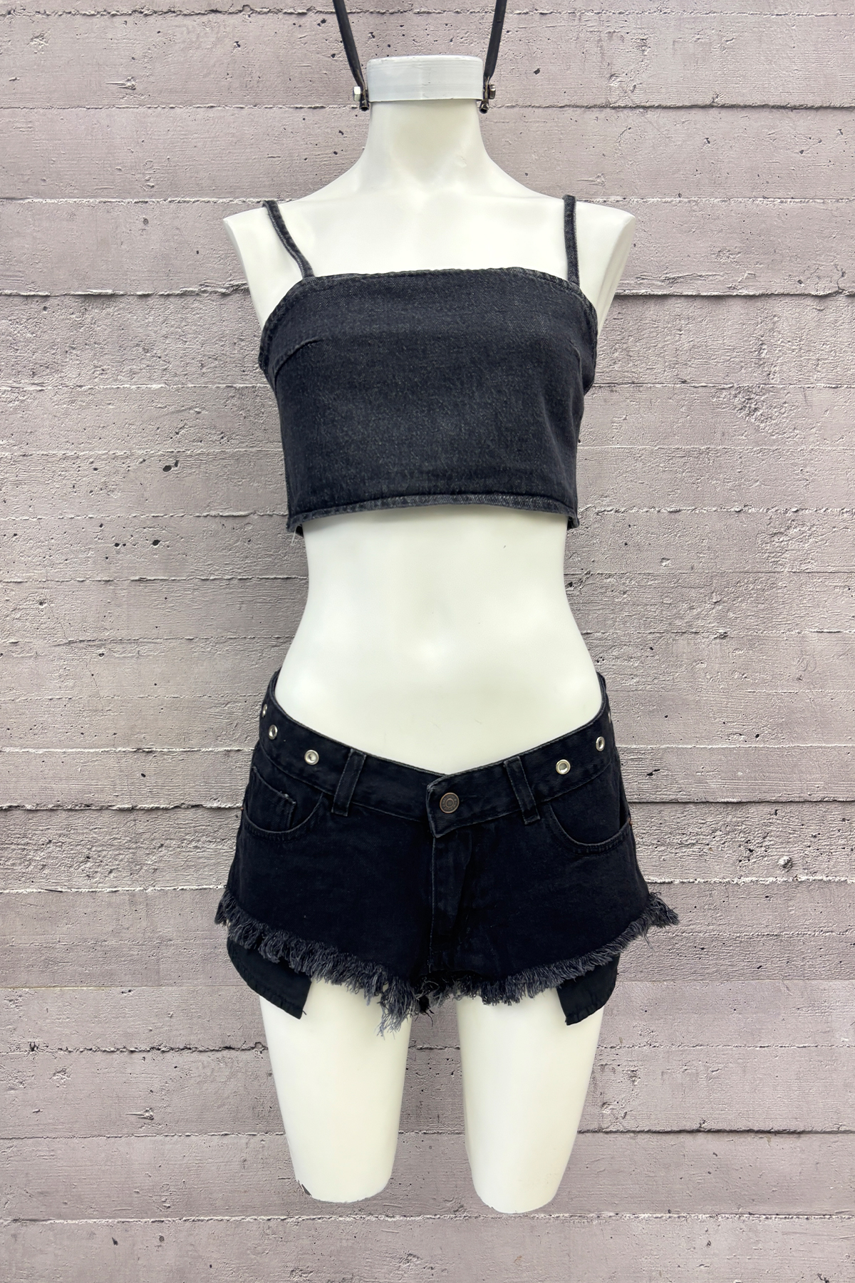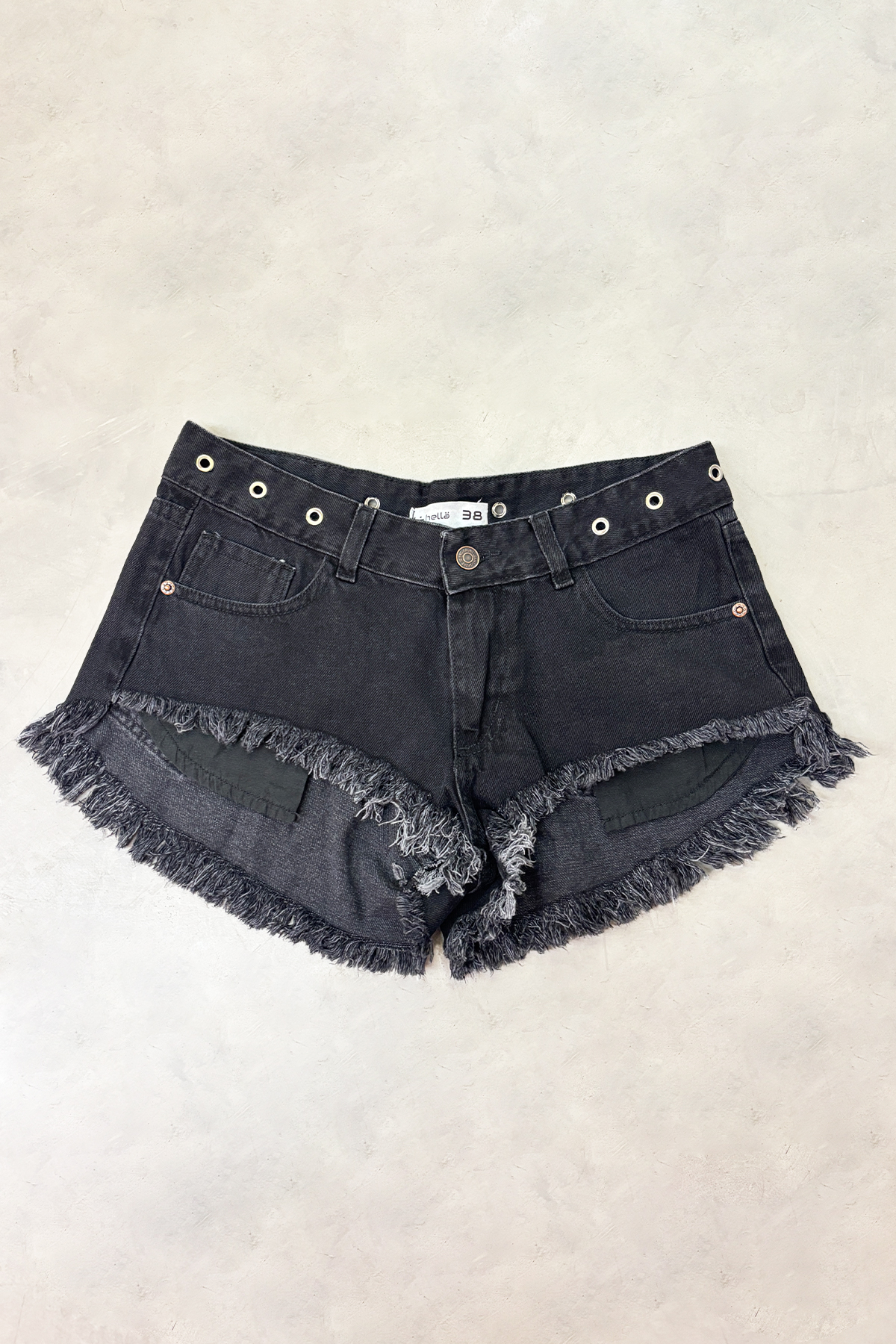 Short de jean negro cavado desflecado rígido con tacha de ojalillo en la cintura, tiro bajo.