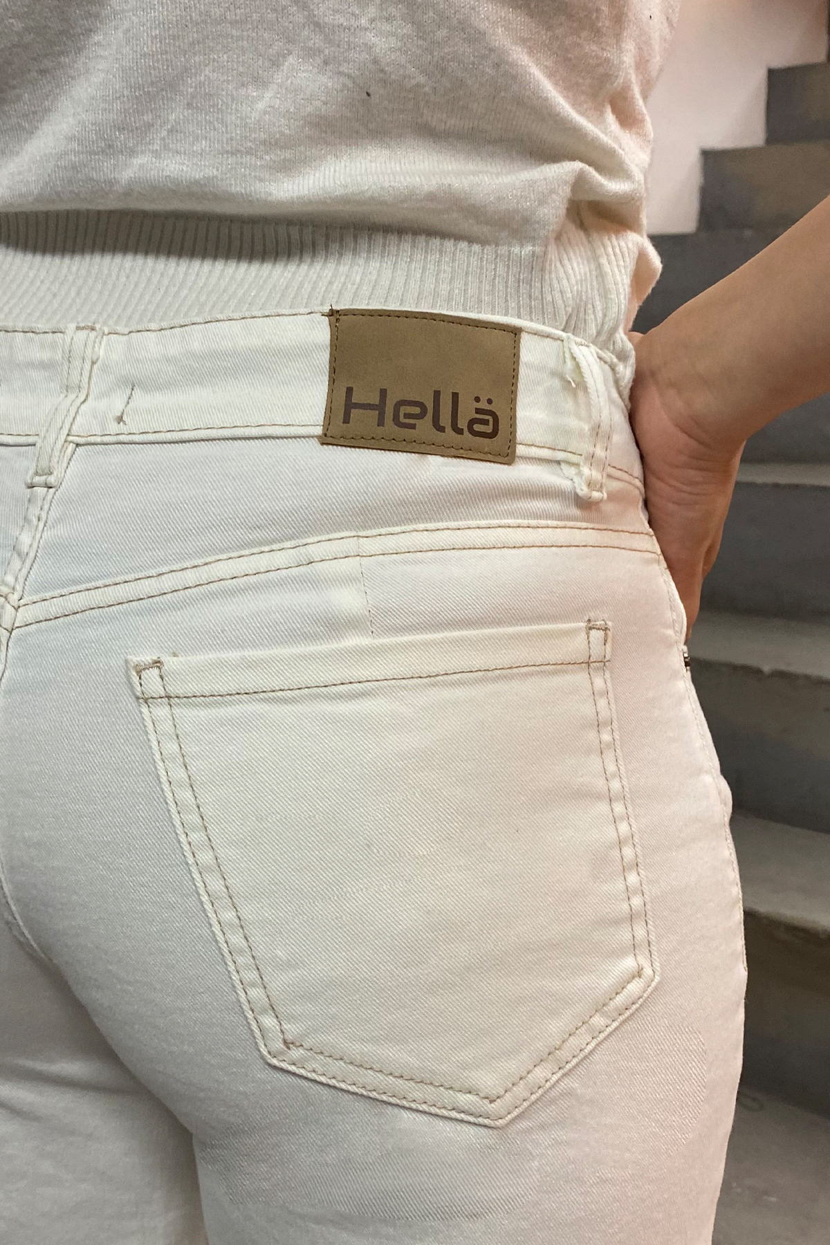 Pantalón wide leg elastizado de gabardina crudo con hilo camel, tiro medio.