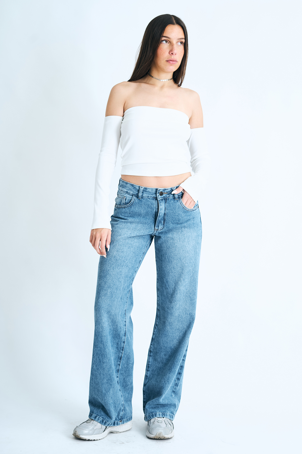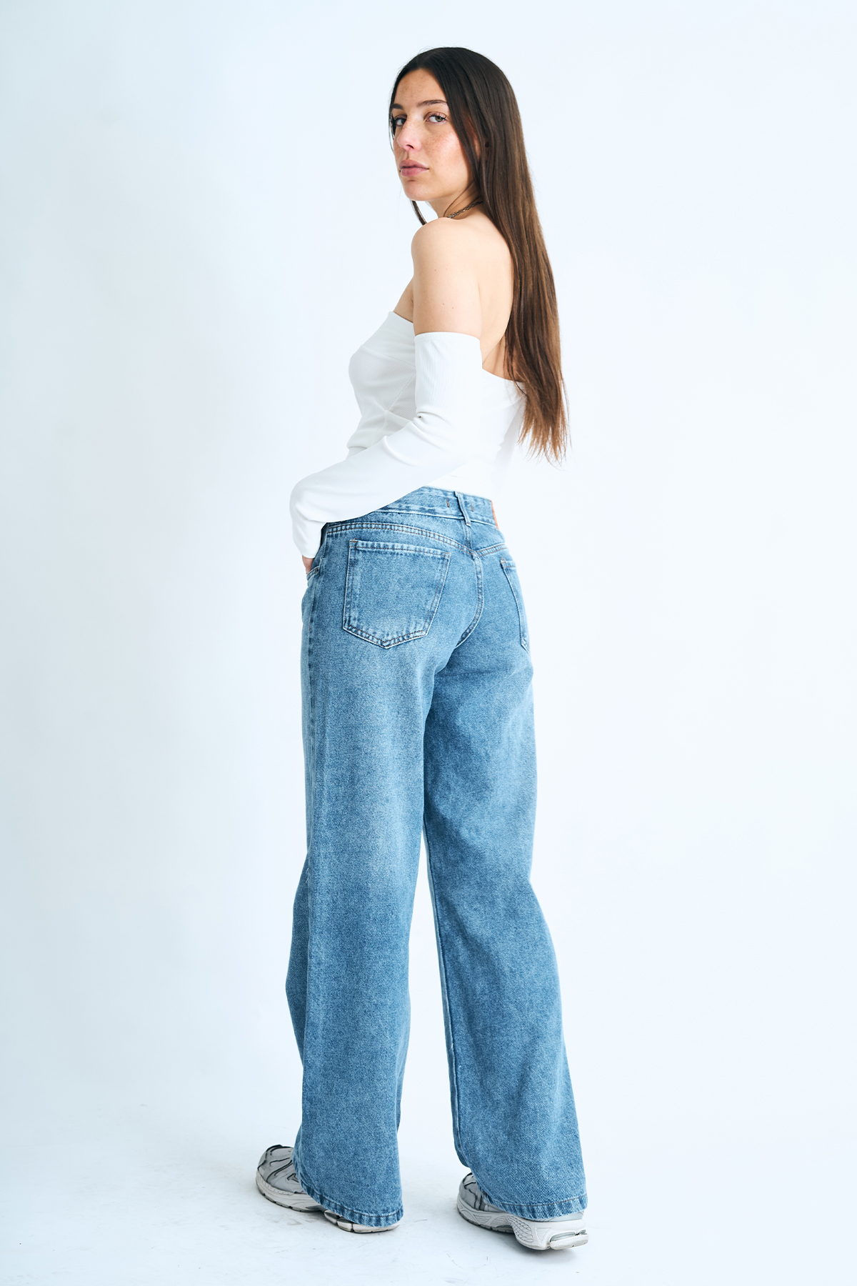 Pantalón wide leg rígido azul con localizado, tiro bajo.