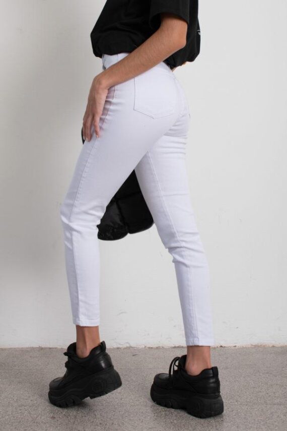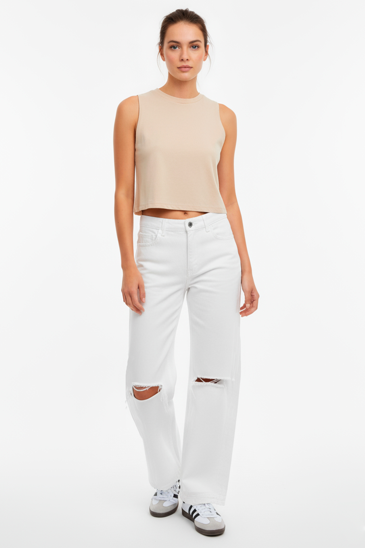 Wide leg de gabardina blanca rígido con rotura en el frente, tiro alto.